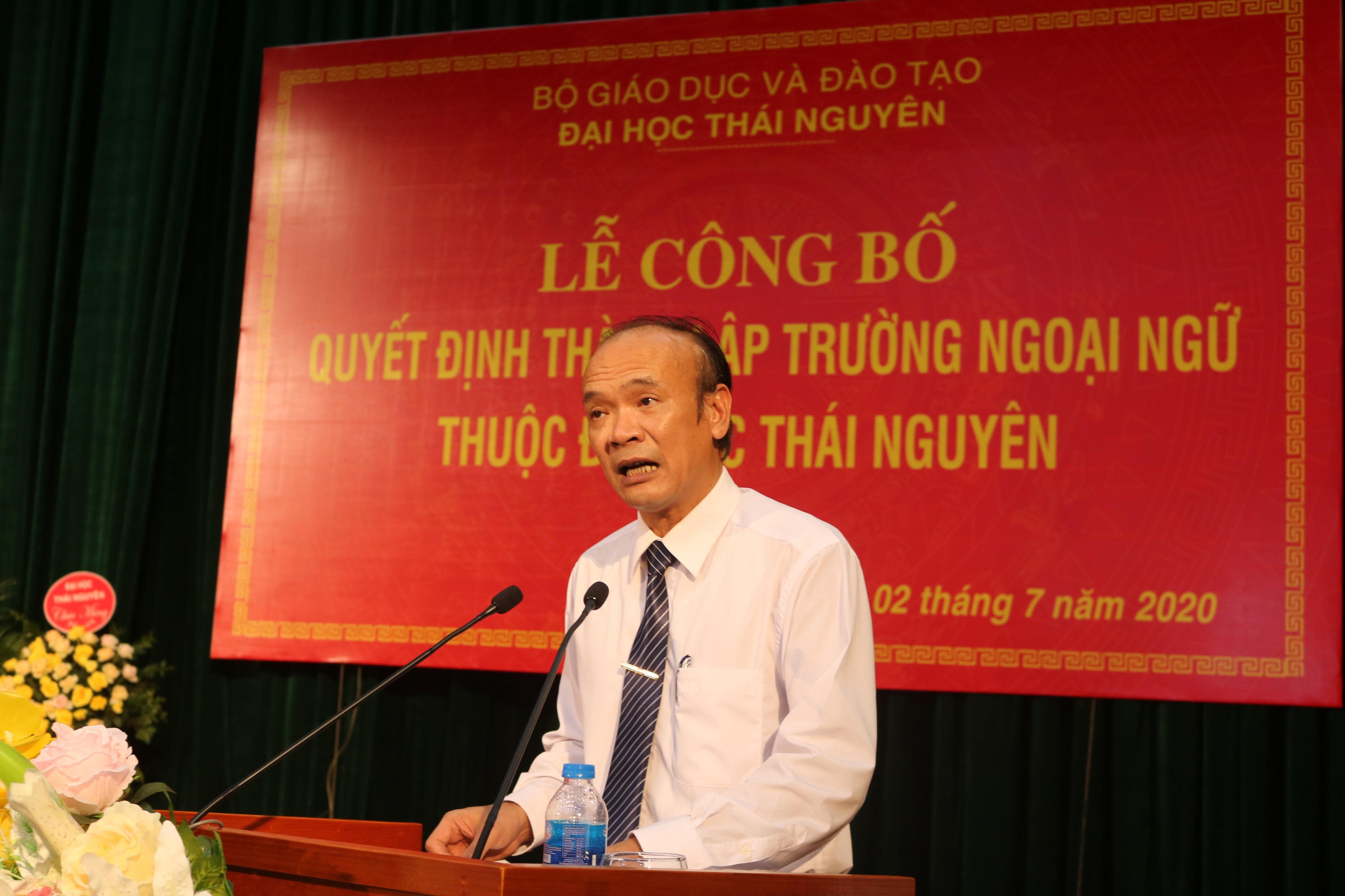 Phát biểu tại buổi lễ, Tiến sĩ Lê Hồng Thắng, Hiệu trưởng Trường Ngoại ngữ cảm ơn sự quan tâm chỉ đạo của ĐH Thái Nguyên, sự tạo điều kiện của cấp ủy đảng, chính quyền địa phương, sự chia sẻ phối hợp của các đối tác, đơn vị bạn, đặc biệt là sự quyết tâm, đóng góp công sức trí tuệ của toàn thể cán bộ, giảng viên, học viên, sinh viên các thế hệ Khoa để có một Trường Ngoại ngữ hôm nay.
