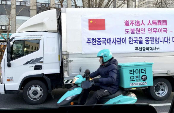 Chiếc xe tải chở khẩu trang tình nghĩa có treo biểu ngữ là danh ngôn nổi tiếng của học giả Thôi Trí Viễn, một người Triều Tiên du học và làm quan thời nhà Đường, "Đạo bất viễn nhân, nhân vô dị quốc" (Tạm dịch: Đạo chẳng xa người, người không phân nước), cùng biểu ngữ bắt mắt khác "Daegu cố lên! Hàn Quốc cố lên!".