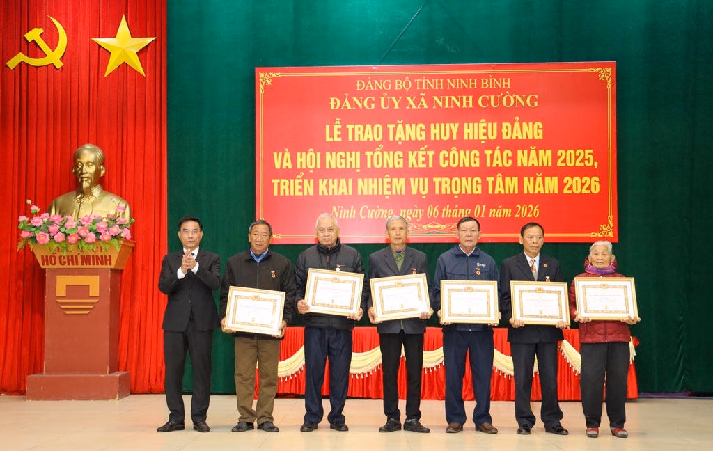 Lãnh đạo Đảng ủy xã Ninh Cường trao tặng Huy hiệu Đảng đợt 7/11 cho các đảng viên đủ điều kiện.
