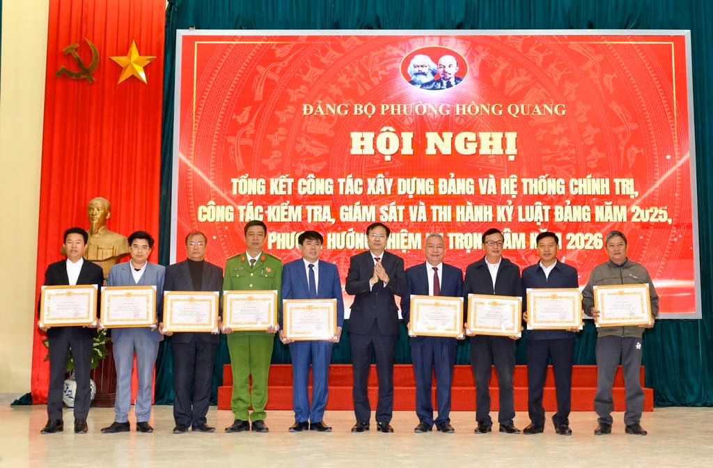 Ông Đinh Xuân Hùng - Bí thư Đảng ủy, Chủ tịch HĐND phường Hồng Quang tặng Giấy khen cho các tập thể, cá nhân có thành tích xuất sắc trong công tác xây dựng Đảng năm 2025.