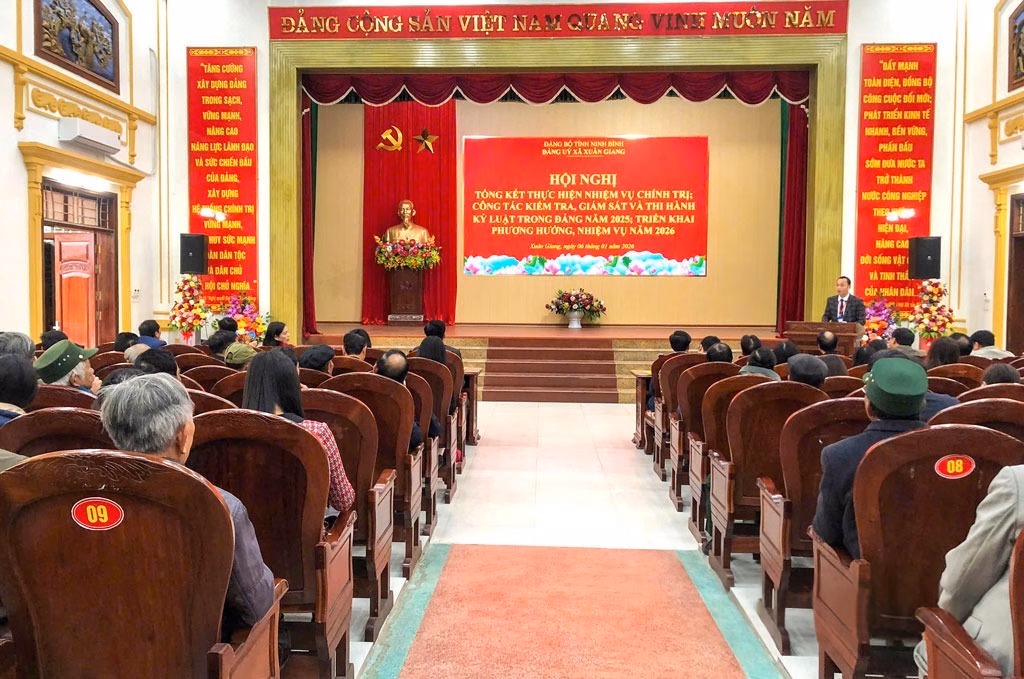 (PLVN) - Ngày 6/1, Đảng ủy các phường, xã Hồng Quang, Xuân Giang, Ninh Cường (tỉnh Ninh Bình) đã tổ chức hội nghị tổng kết công tác năm 2025 và triển khai nhiệm vụ trọng tâm năm 2026. Tham dự hội nghị có các lãnh đạo cấp ủy, chính quyền, Mặt trận Tổ quốc và đại diện cán bộ chủ chốt của các địa phương.