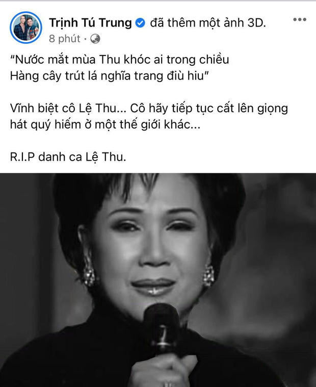 Vào 11h sáng (giờ Việt Nam), Jimmy Nhựt Hà đã thông báo tin buồn về việc nữ danh ca Lệ Thu qua đời ở tuổi 78 vì mắc bệnh Covid thông qua con gái lớn tên Tú. Trên Facebook cá nhân, anh viết: "Sau một thời gian chống chọi với cơn bạo bệnh, nữ danh ca Lệ Thu đã qua đời lúc 7:00pm, ngày 15 tháng 1 năm 2021 (giờ địa phương tại Mỹ - PV). Chúng ta cùng cầu nguyện cho linh hồn Cecilia Lệ Thu an nghỉ'.Từ đây 'Nước Mắt Mùa Thu' sẽ thôi 'khóc thân phận mình'. Được sự ủy quyền của gia đình, Jimmy sẽ cập nhật ngày giờ tang lễ trong thời gian sớm nhất".
