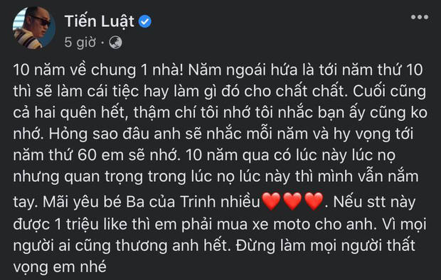 Nam danh hài còn hứa mỗi năm sẽ nhắc nhở Thu Trang về việc làm bữa tiệc ấy, hi vọng tới năm thứ 60 của cuộc đời thì bà xã sẽ nhớ. Thật chẳng mấy khi thấy Tiến Luật lại công khai nói lời ngọt ngào với Thu Trang đến vậy. Nhưng ngay đến câu kết, nam danh hài không quên thể hiện sự lầy lội: "Mãi yêu bé Ba của Trinh nhiều. Nếu bài đăng này được 1 triệu like thì em phải mua xe moto cho anh vì mọi người ai cũng thương anh hết. Đừng làm mọi người thất vọng em nhé!".