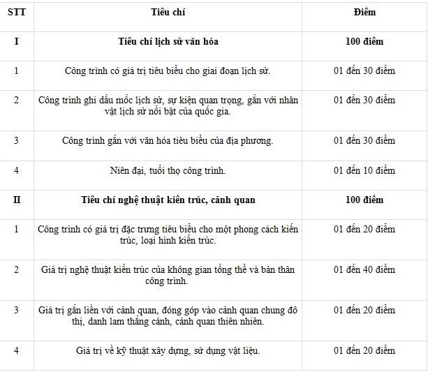 Theo đó, tiêu chí đánh giá công trình kiến trúc có giá trị xác định như sau: Tiêu chí lịch sử - văn hóa gồm: Công trình có giá trị tiêu biểu cho giai đoạn lịch sử; công trình ghi dấu mốc lịch sử, sự kiện quan trọng, gắn với nhân vật lịch sử nổi bật của quốc gia; công trình gắn với văn hóa tiêu biểu của địa phương; niên đại, tuổi thọ công trình.