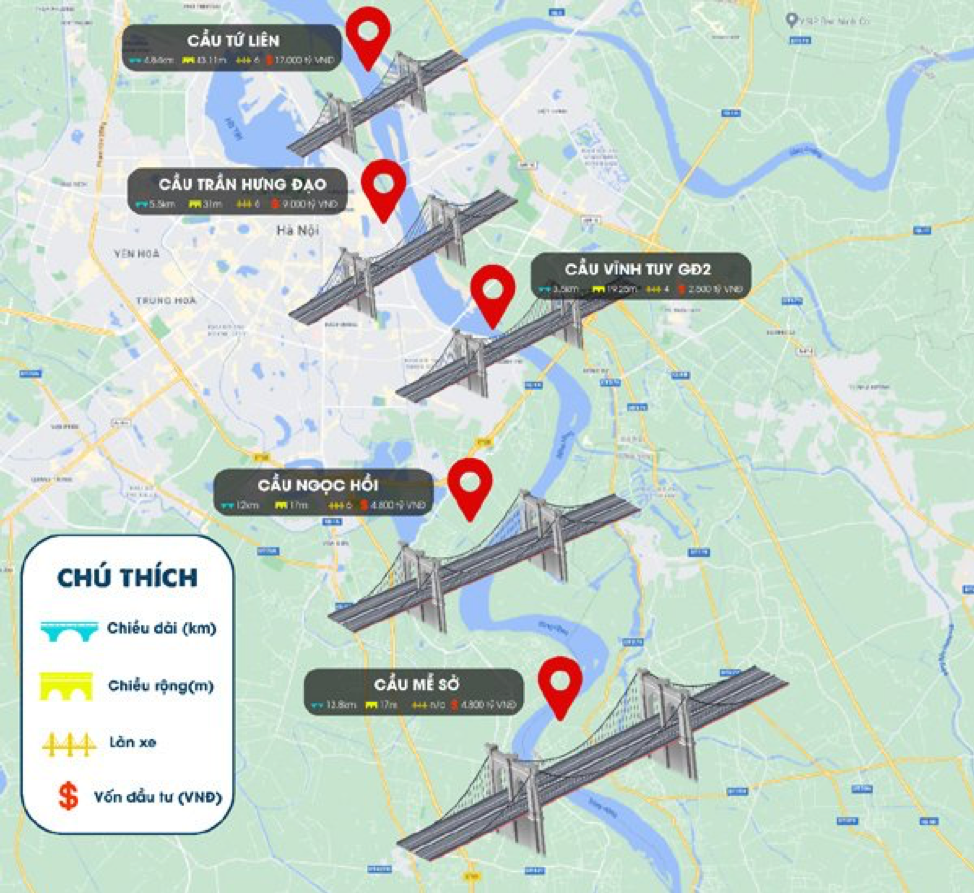 Theo quy hoạch chung của Thủ đô đến năm 2030, tầm nhìn 2050, ngoài các cây cầu hiện hữu như Long Biên, Chương Dương, Vĩnh Tuy, Thanh Trì, Nhật Tân, Thăng Long thì Hà Nội sẽ có tổng cộng 18 công trình đường bộ vượt sông Hồng trong tương lai gần, đáng chú ý là cây cầu Tứ Liên với vốn đầu tư hơn 17.000 tỷ đồng.