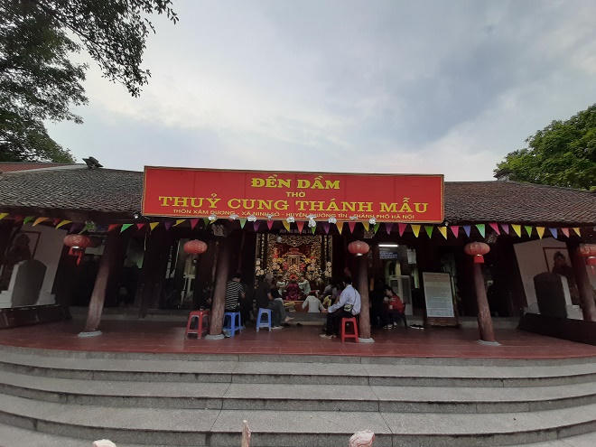 Trong thần phả đền Xâm Dương (đền Dầm) tại Thường Tín, Hà Nội có ghi lại chuyện Thánh Mẫu hiển linh thời Trần Nhân Tông chống giặc Nguyên Mông. Bấy giờ, Vua ban Việt Cờ Mai cho Hưng Đạo Vương Trần Quốc Tuấn làm đại nguyên soái chống giặc. Khi qua Xâm Miện (nơi có đền Dầm và Xâm Thị ngày nay) trời đà xẩm tối bèn cho quân sỹ thuyền bè neo đậu lại bên sông nghỉ lại.