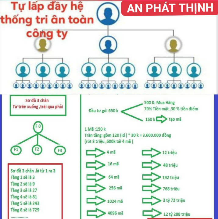 (PLVN) - Chỉ cần đầu tư 650 nghìn đồng khi tràn tầng sẽ được tri ân 12,8 tỷ đồng, đầu tư 65 triệu đồng thì thu về 1.280 tỷ đồng. Đó là chiêu trò mà Công ty Cổ phần Sản xuất và Thương mại An Phát Thịnh tung ra để dụ dỗ các “con mồi” đầu tư vào sàn thương mại điện tử “ảo” của công ty nhằm chiếm đoạt tài sản.