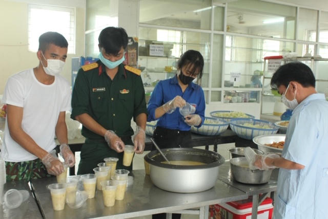 Ngoài tiêu chuẩn theo quy định, đơn vị còn hỗ trợ thêm kinh phí cho mỗi suất ăn nên các bữa ăn khá phong phú, đa dạng, đầy đủ dinh dưỡng. Thức ăn được chia theo suất và tất cả các dụng cụ sử dụng trong bữa ăn đều chỉ được dùng một lần.