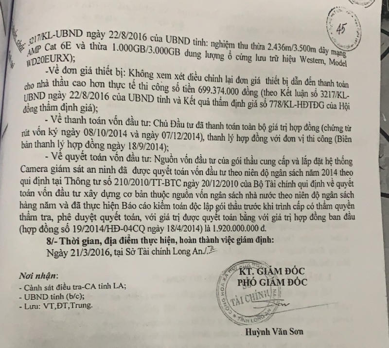 Hơn 1 năm sau khi nghiệm thu dự án, tới ngày 12/11/2015, tỉnh có quyết định thanh tra gói thầu, hơn 9 tháng sau mới ra KLTT số 3217. Mãi ngày 22/12/2016, Chủ tịch tỉnh có Công văn 244/UBND-NC “chuyển hồ sơ sang CQĐT Công an tỉnh xử lý”. Sau nhiều năm, đã 4 lần VKS trả hồ sơ điều tra bổ sung, đình chỉ rồi phục hồi điều tra. Công an tỉnh chuyển Công an TP Tân An thụ lý, rồi cấp dưới lại trả Công an tỉnh. Cả hai lần mở phiên sơ thẩm, vụ án đều bị TAND trả hồ sơ điều tra bổ sung.