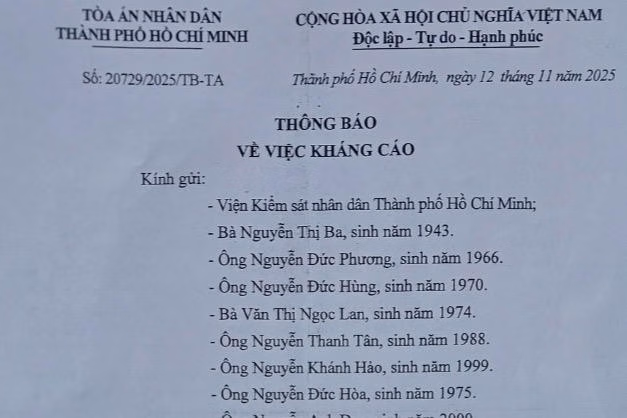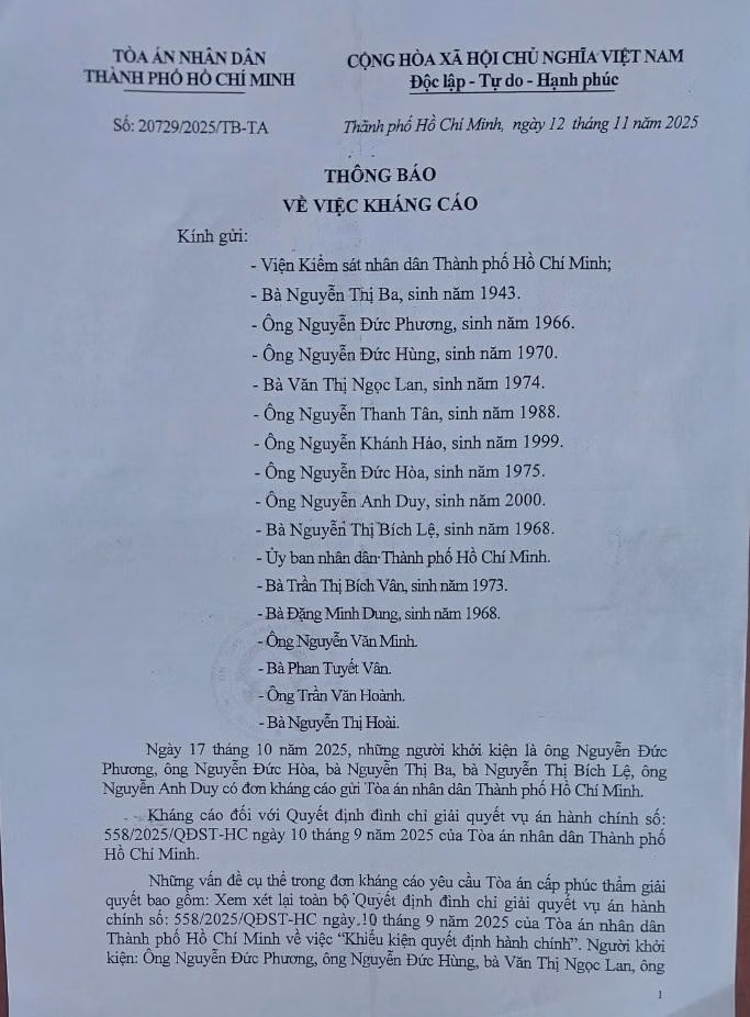 (PLVN) - Liên quan sự việc “1 nhà đất, nhiều vụ kiện” tại phường Hiệp Bình mà TAND TP HCM đã có quyết định đình chỉ giải quyết vụ án (ĐCGQVA); mới đây, TAND TP có Thông báo 20729/2025/TB-TA về việc kháng cáo, theo đó những người khởi kiện có đơn đề nghị xem xét lại toàn bộ Quyết định ĐCGQVA 558/2025/QĐST-HC ngày 10/9/2025.