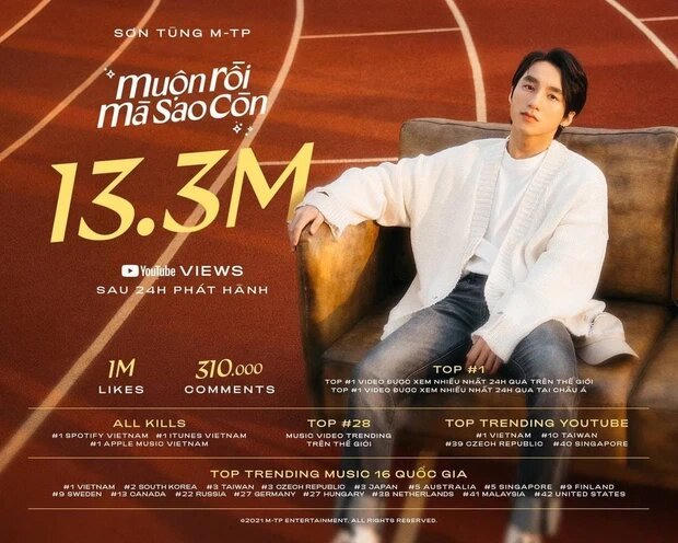 Sau 24 giờ ra mắt MV Muộn Rồi Mà Sao Còn, MV nhận được 12,8 triệu lượt xem, 1 triệu lượt thích. Với những thành tích đó, Muộn Rồi Mà Sao Còn dễ dàng “đánh bật” những sản phẩm khác để giữ vững vị trí top 1 trending YouTube Việt Nam.