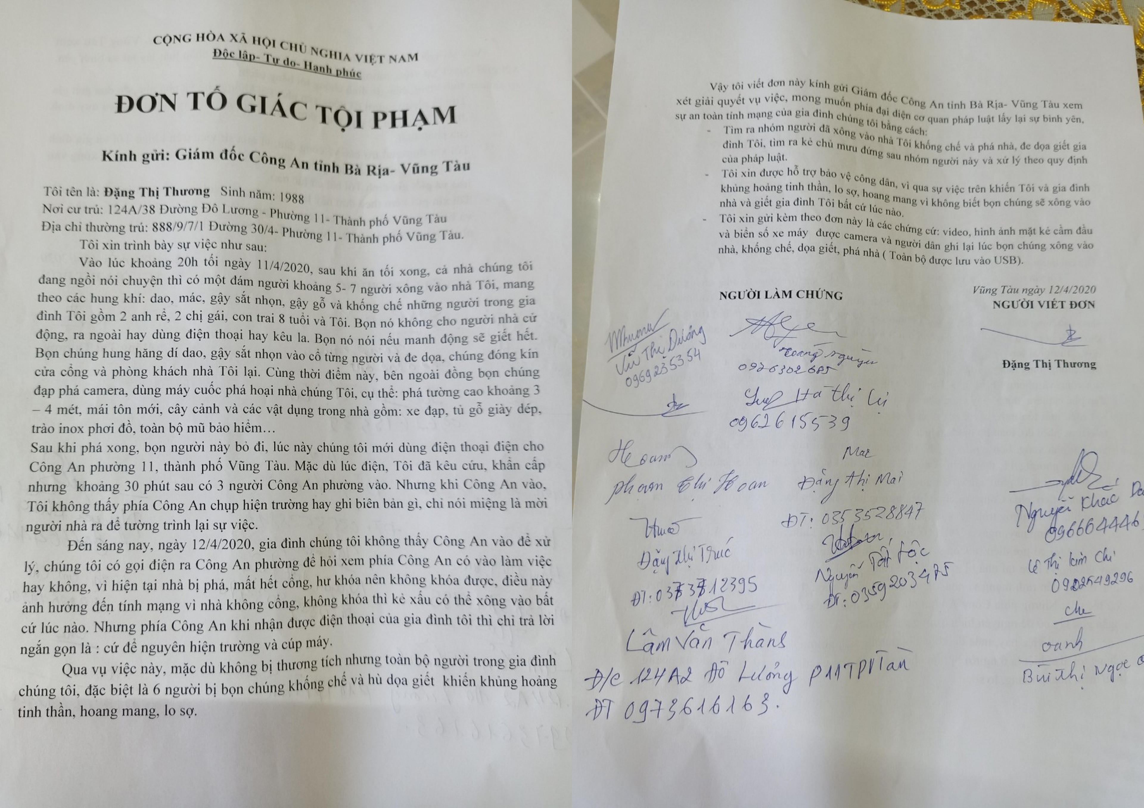 Chị Đặng Thị Thương đã có đơn tố giác tội phạm gửi tới Công an tỉnh Bà Rịa - Vũng Tàu yêu cầu can thiệp, bảo vệ quyền và lợi ích hợp pháp của mình.