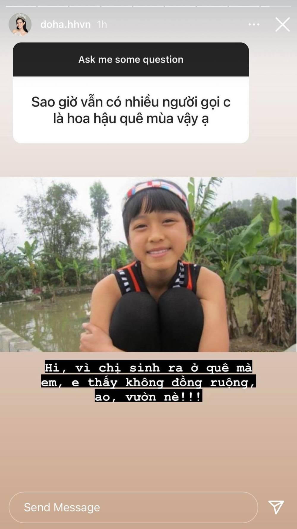 Mới đây trên mục Instagram story, Đỗ Thị Hà đã thực hiện mục Hỏi – đáp cùng khán giả. Nhận được thắc mắc về biệt danh “Hoa hậu quê mùa”, người đẹp 19 tuổi tỏ thái độ nhẹ nhàng, cho thấy bản thân rất tự hào khi sinh ra từ làng quê. “Hi, vì chị sinh ra ở quê mà em, em thấy không đồng, ruộng, ao, vườn nè”, Đỗ Thị Hà viết.
