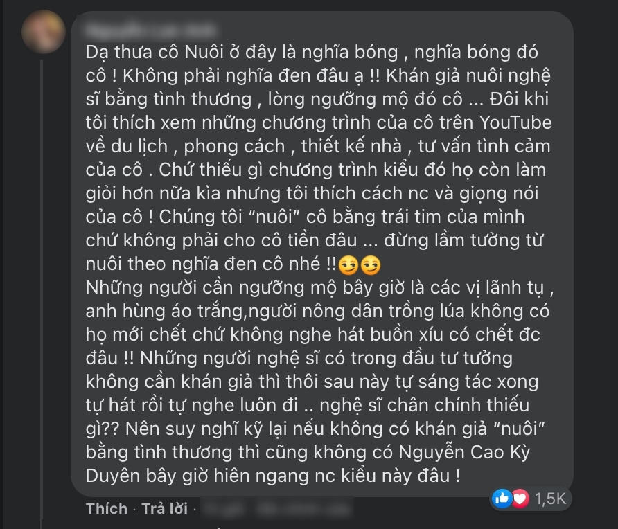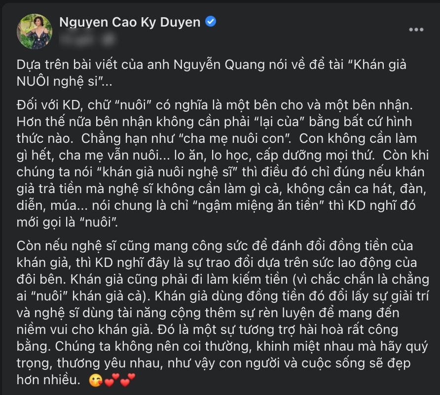 Nguyễn Cao Kỳ Duyên nhấn mạnh: "Chỉ "ngậm miệng ăn tiền" thì Kỳ Duyên nghĩ đó mới gọi là nuôi". Cô chia sẻ thêm: "Còn nếu nghệ sĩ cũng mang công sức để đánh đổi đồng tiền của khán giả, thì Kỳ Duyên nghĩ đây là sự trao đổi dựa trên sức lao động của đôi bên. Khán giả cũng phải đi làm kiếm tiền (vì chắc chắn là chẳng ai "nuôi" khán giả cả). Khán giả dùng đồng tiền đó đổi lấy sự giải trí và nghệ sĩ dùng tài năng cộng thêm sự rèn luyện để mang đến niềm vui cho khán giả. Đó là một sự tương trợ hài hoà rất công bằng".