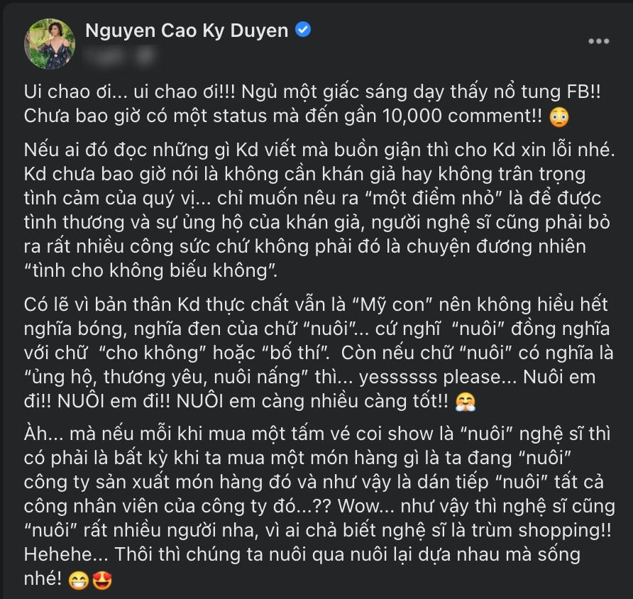 Cô chia sẻ: "Có lẽ vì bản thân Kỳ Duyên không hiểu hết nghĩa bóng, nghĩa đen của chữ "nuôi". Cứ nghĩ "nuôi" đồng nghĩa với chữ "cho không" hoặc "bố thí". Còn nếu chữ "nuôi" có nghĩa là "ủng hộ, thương yêu, nuôi nấng" thì vâng, làm ơn nuôi em đi! Nuôi em đi! Nuôi em càng nhiều càng tốt!".