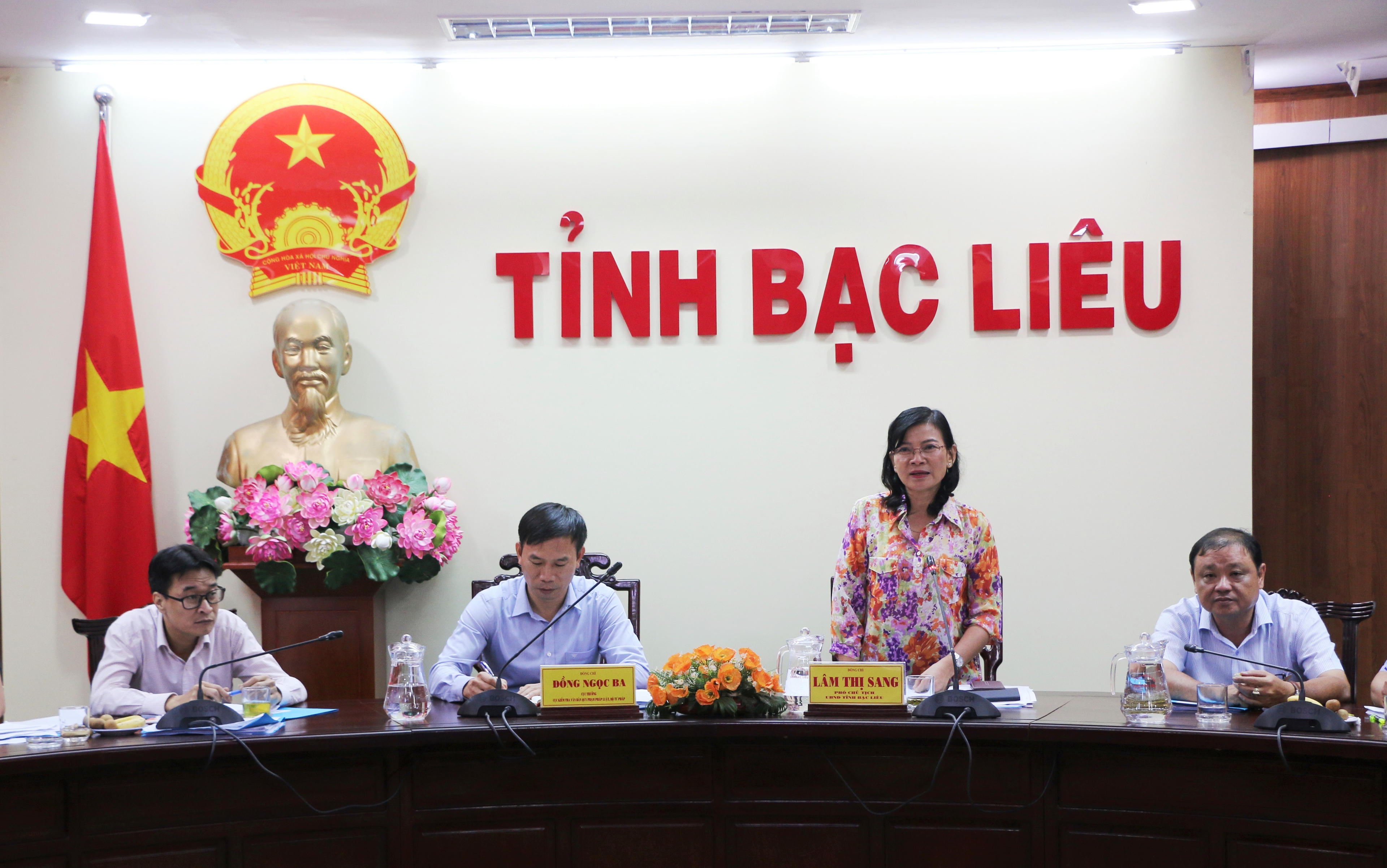 (PLVN) -Ngày 25/10, bà Lâm Thị Sang - Phó Chủ tịch UBND tỉnh Bạc Liêu tiếp và làm việc với Đoàn kiểm tra liên ngành Bộ Tư pháp do ông Đồng Ngọc Ba - Cục trưởng Cục kiểm tra văn bản quy phạm pháp luật (QPPL) làm Trưởng đoàn về kiểm tra, xử lý, rà soát hệ thống văn bản QPPL trên địa bàn tỉnh.