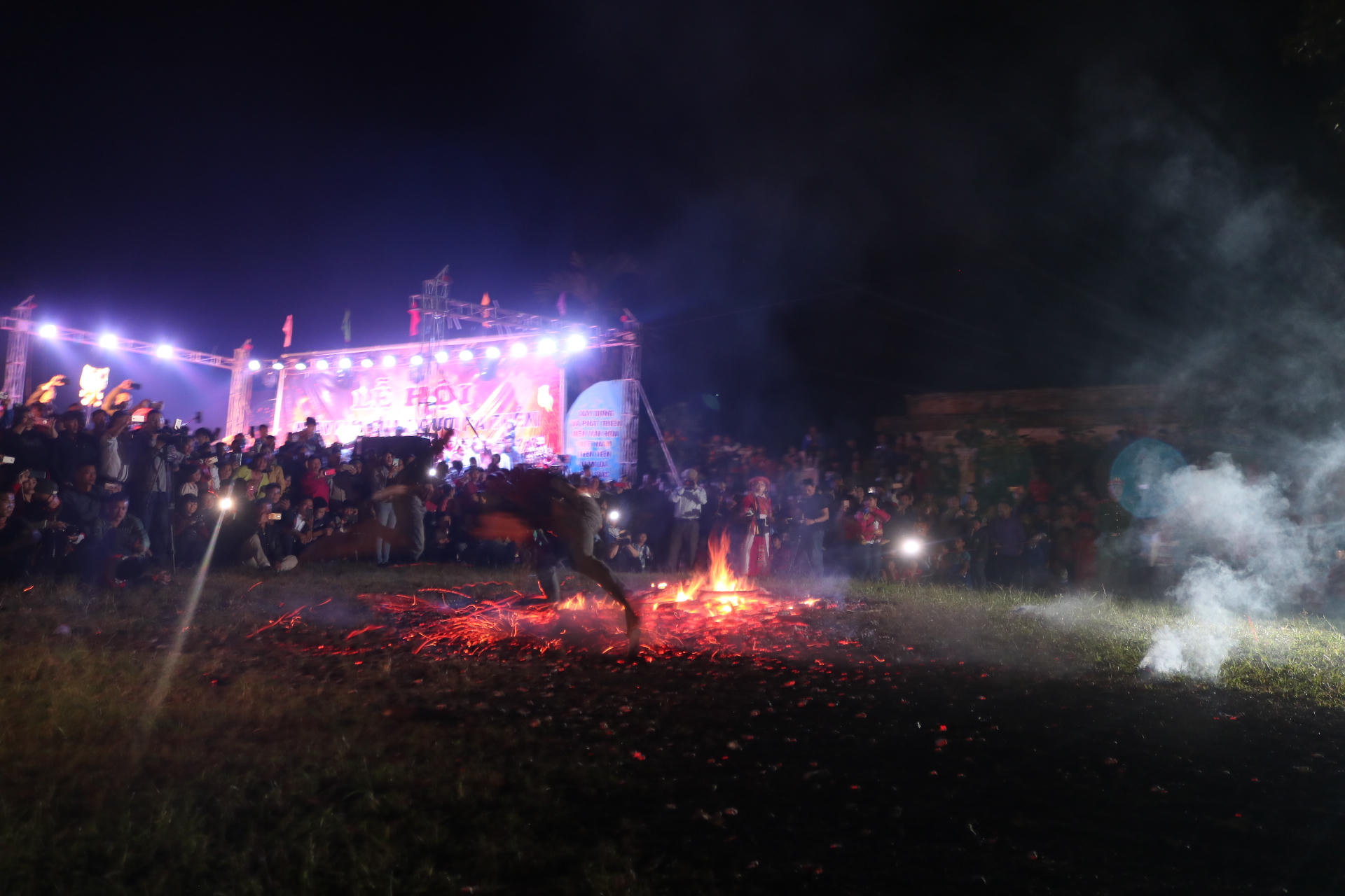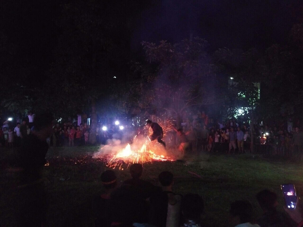 Những thanh niên cúi gập người, nhảy lò cò bằng cả hai chân trên cát xung quanh đống lửa. Họ nhảy hẳn vào đống lửa và lại nhảy ra trong tiếng hò reo cuồng nhiệt của mọi người. Than đỏ văng tứ tung ra xung quanh. Cứ như thế liên tục, những thanh niên, trong tiếng gõ của thầy mo nhảy vào lửa và có người còn nằm hẳn trên đống lửa rồi mới nhảy ra ngoài.