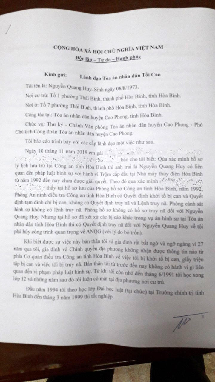 Trong đơn, ông Huy trình bày, năm 1999 làm Phó bí thư rồi Bí thư chi đoàn tổ 1 phường Nguyễn Thái Bình. Năm 1999, ông Huy được kết nạp Đảng. Cũng trong năm này, ông Huy thi tuyển công chức ngành tòa án, được trúng tuyển và điều về làm thư ký TAND huyện Yên Thủy. Năm 2000, ông Huy chuyển về TAND huyện Cao Phong và năm 2005 thì được cử đi học lớp nghiệp vụ thẩm phán.