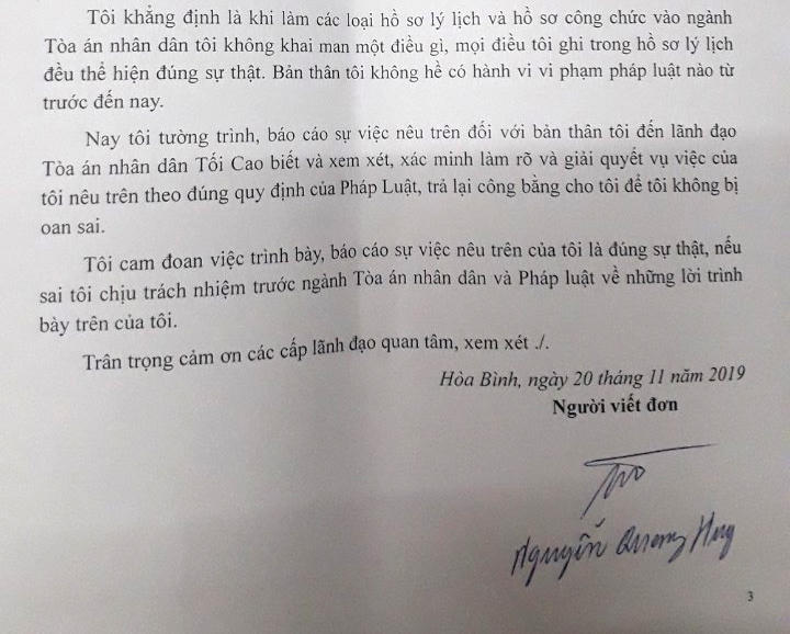 Ông Huy cam đoan nội dung mình gửi tới TAND tối cao là đúng sự thật, không khai man hồ sơ và không vi phạm pháp luật nên đề nghị các cơ quan làm rõ để trả lại danh dự cho mình, không bị oan sai.