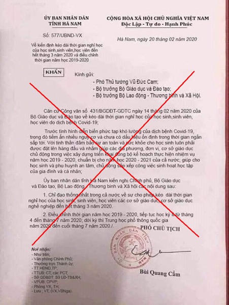 Trước đó, ngày 20/2/2020, trên mạng xã hội facebook lan truyền văn bản UBND tỉnh Hà Nam gửi Phó Thủ tướng Vũ Đức Đam;Bộ trưởng Bộ Giáo dục và Đào tạo;Bộ trưởng Bộ Lao động, Thương binh và Xã hội đề nghị kéo dài thời gian nghỉ học đến hết tháng 3 năm 2020.
