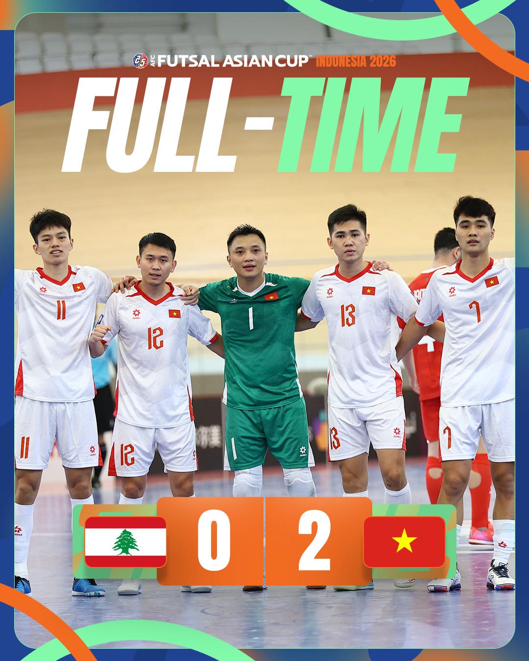 Chung cuộc, đội tuyển futsal Việt Nam giành chiến thắng 2-0 trước Lebanon, qua đó có được 6 điểm sau hai trận toàn thắng tại bảng B Vòng chung kết futsal châu Á 2026, mở rộng cánh cửa tiến vào tứ kết.