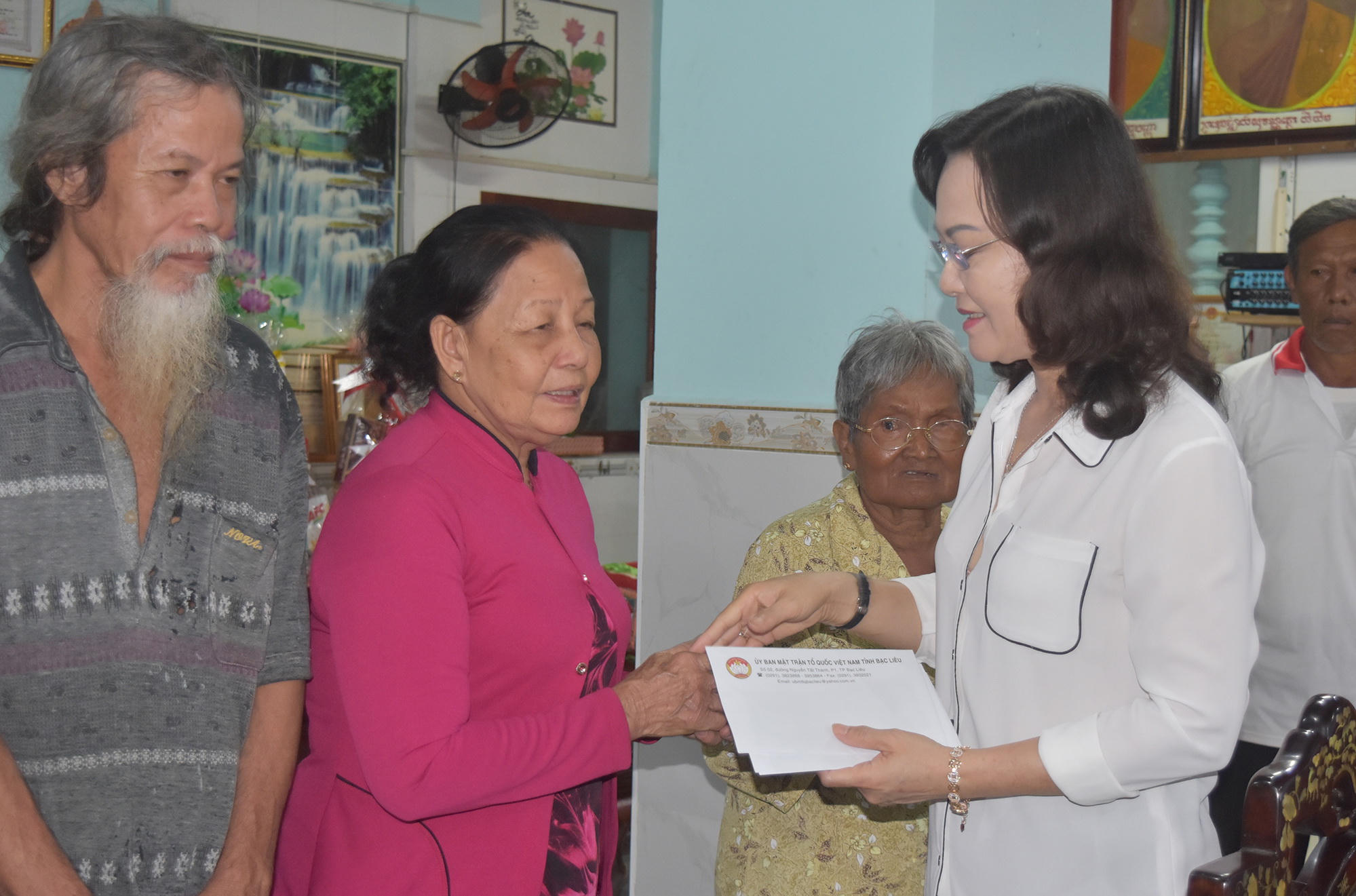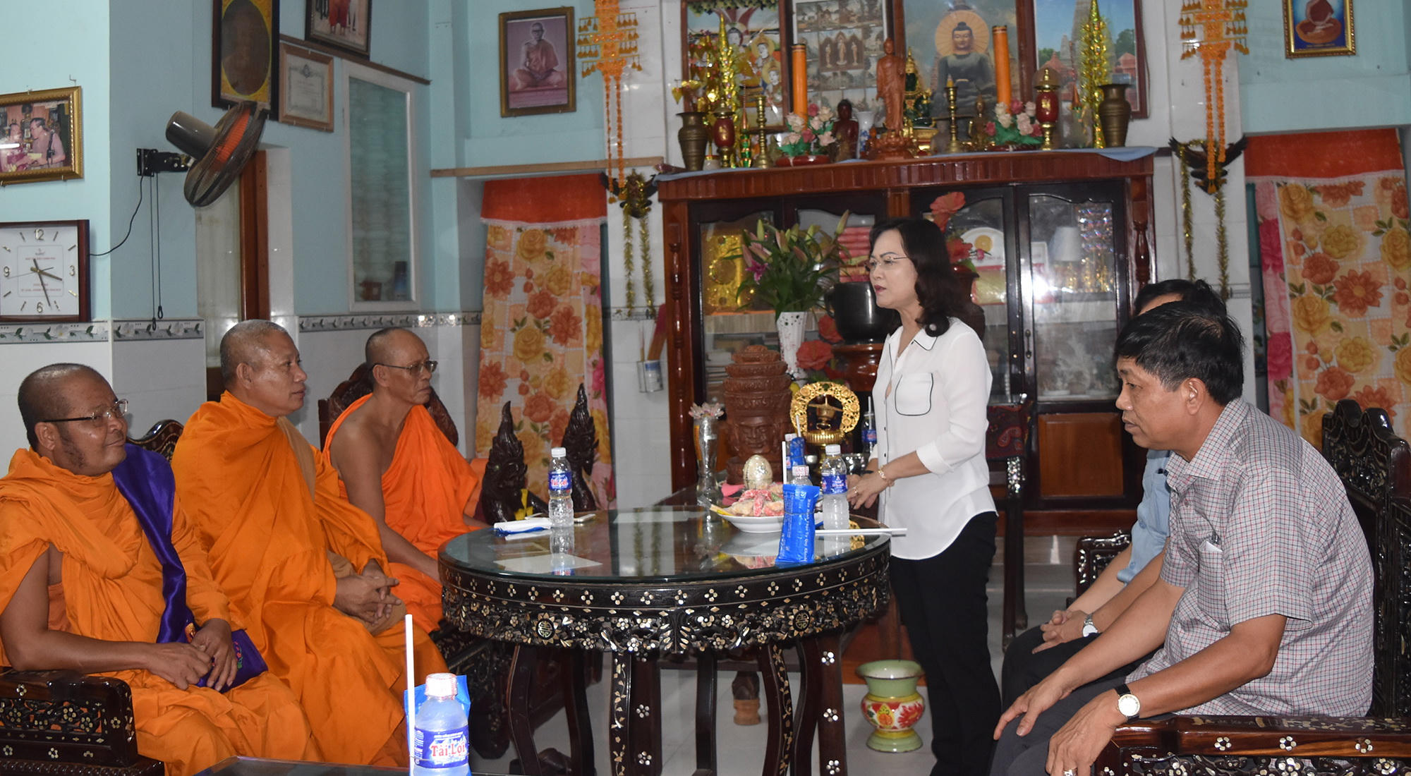 Phó Bí thư Thường trực Tỉnh ủy, Chủ tịch HĐND tỉnh Bạc Liêu - Lê Thị Ái Nam, thông báo tóm tắt với Hoà Thượng Hữu Hinh - Chủ tịch Hội Đoàn kết sư sãi yêu nước tỉnh cùng các vị chức sắc, Ban quản trị chùa Cù Lao về những kết quả trong phát triển kinh tế, xã hội mà tỉnh Bạc Liêu đã gặt hái được trong thời gian qua.