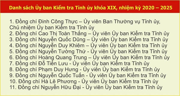 Ban Chấp hành Đảng bộ tỉnh đã bầu 11 đồng chí vào Uỷ ban Kiểm tra Tỉnh ủy với số phiếu tín nhiệm cao. Đồng chí Đinh Công Thực - Ủy viên Ban Thường vụ Tỉnh ủy, Chủ nhiệm Ủy ban Kiểm tra Tỉnh ủy khóa XVIII, nhiệm kỳ 2015-2020 tiếp tục được bầu giữ chức Chủ nhiệm Uỷ ban Kiểm tra Tỉnh ủy khóa XIX, nhiệm kỳ 2020-2025.