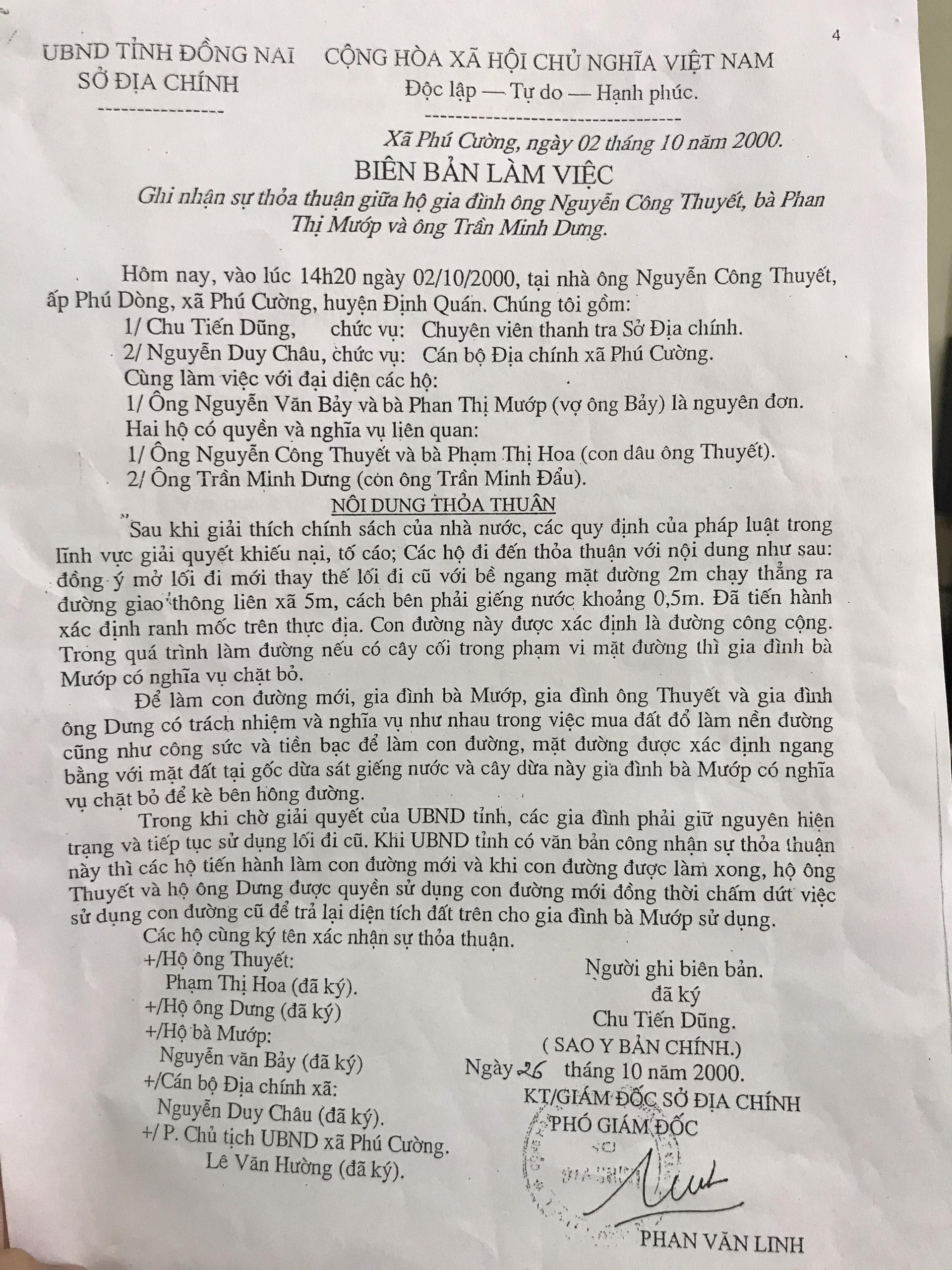 Trao đổi với phóng viên, ông Thái Văn Tây – Phó Chủ tịch UBND xã Phú Cường cho biết: “vào năm 2000, việc thỏa thuận giữa hộ gia đình ông Nguyễn Công Thuyết, bà Phan Thị Mướp và ông Trần Minh Dưng đã được Sở Địa chính lập biên bản, trong đó thể hiện các hộ đồng ý mở lối đi mới thay thế lối đi cũ với bề ngang mặt đường 2m, chạy thằng ra đường giao thông liên xã rồi, xã đã có trả lời những người dân không chấp nhận.”