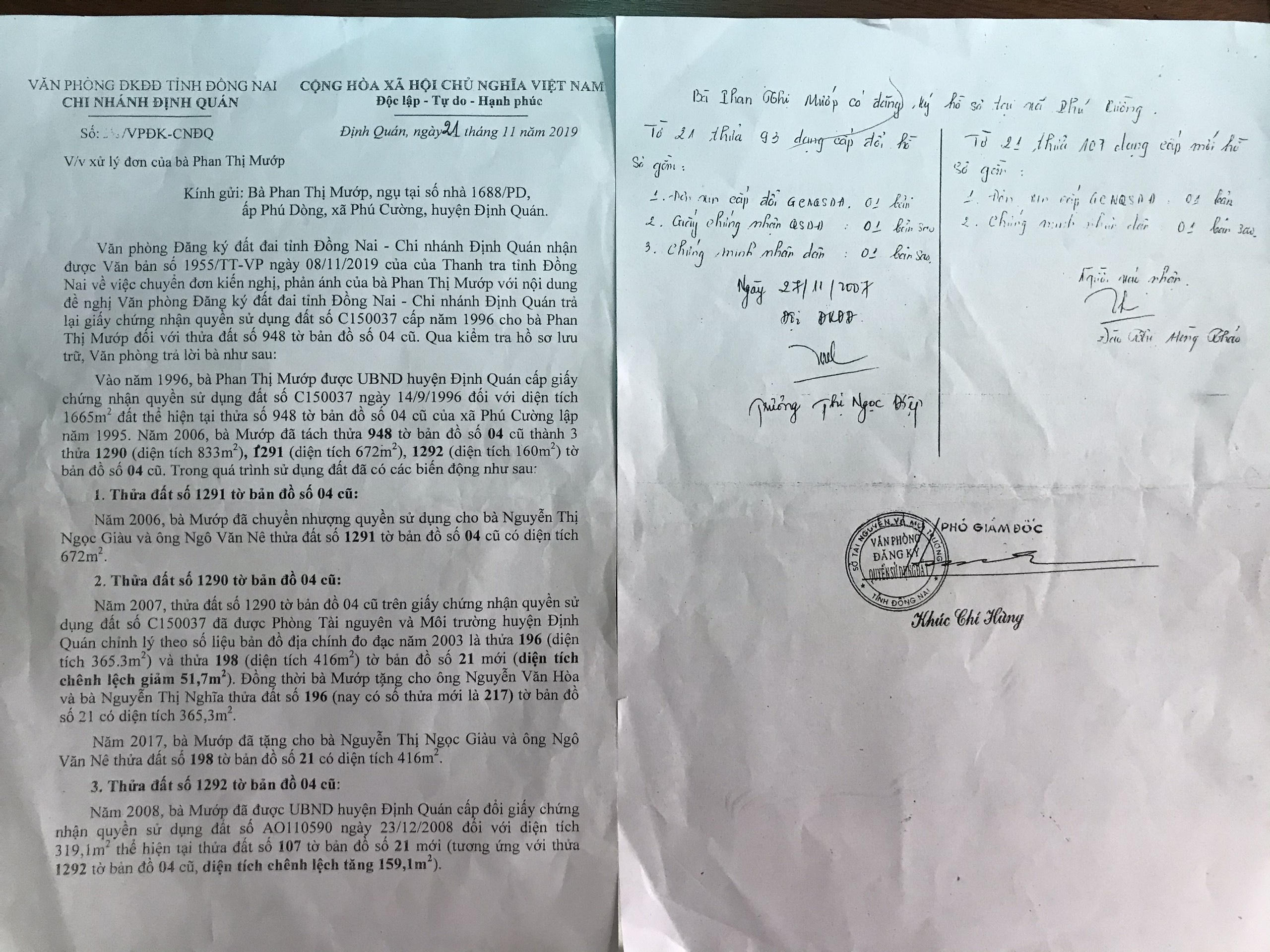 Sau khi gửi đơn lên Văn phòng Đăng ký Đất đai tỉnh Đồng Nai chi nhánh Định Quán để phán ảnh, ngày 21/1/2019, cơ quan này có gửi văn bản trả lời bà Mướp, văn bản có thể hiện biến động đất qua các năm.