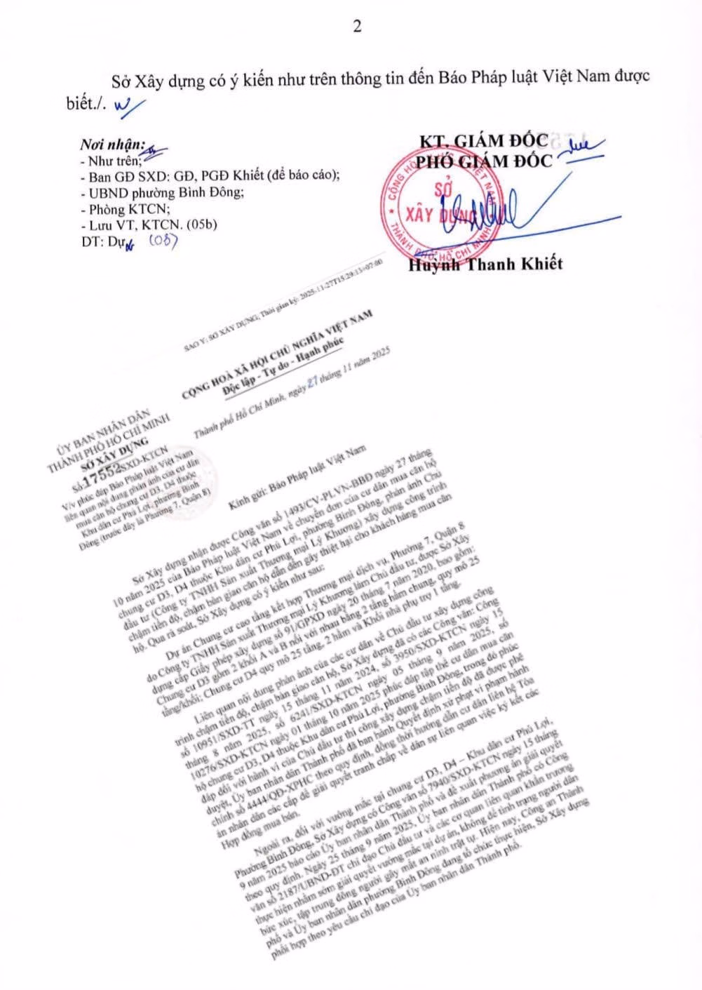 Liên quan phản ánh về CĐT xây dựng công trình chậm tiến độ, chậm bàn giao căn hộ, Sở Xây dựng đã có các công văn phúc đáp cư dân mua căn hộ chung cư D3, D4. Hành vi của CĐT thi công xây dựng chậm tiến độ, UBND TP đã có Quyết định xử phạt 4444/QĐ-XPHC ngày 8/10/2024, phạt Cty Lý Khương 500 triệu đồng; đồng thời hướng dẫn cư dân liên hệ tòa án để giải quyết tranh chấp dân sự liên quan việc ký kết các hợp đồng mua bán.
