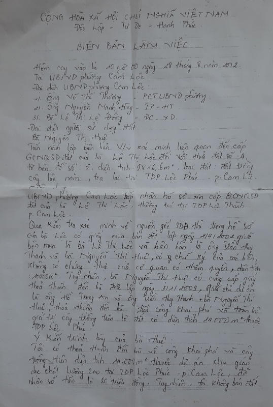 Biên bản được lập, có chữ ký, đóng dấu, nhưng không hiểu tại sao, trong năm 2012 này bà Lộc vẫn được UBND TP Cam Ranh cấp sổ đỏ đứng tên diện tích 10 ngàn m2 của vợ chồng cụ Thanh.