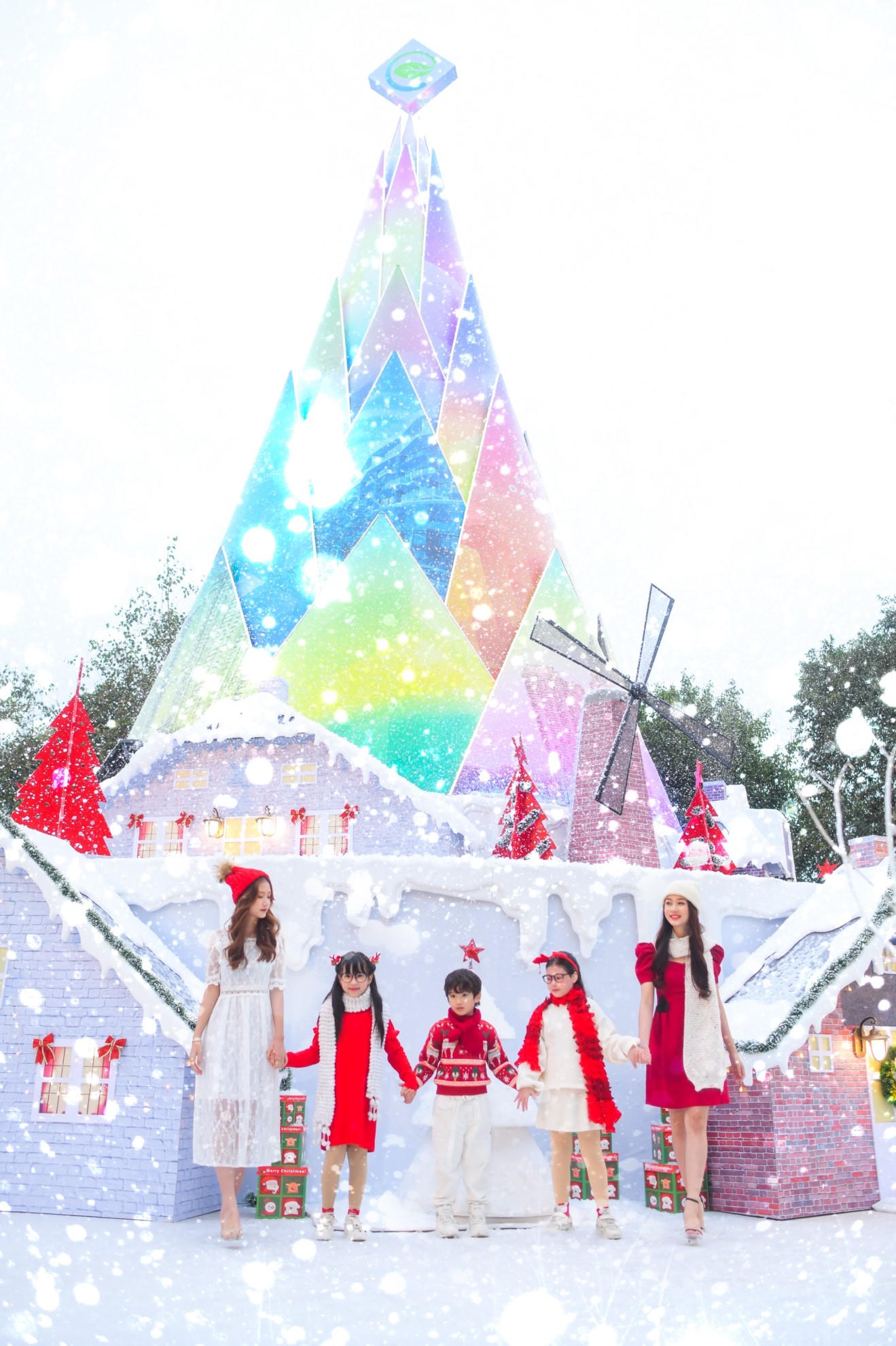 Một ngôi làng cổ tích Bắc Âu lung linh tràn ngập không khí giáng sinh với tuyết rơi được dựng lên trong khuôn viên cây xanh của công viên mùa hạ.