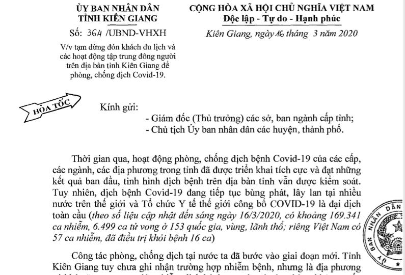 (PLVN) - Sáng ngày 17/03, Theo thông tin từ Văn phòng UBND tỉnh Kiên Giang cho biết, Phó Bí thư Tỉnh ủy, Chủ tịch UBND tỉnh Phạm Vũ Hồng chỉ đạo tạm dừng đón khách du lịch và các hoạt động tập trung đông người trên địa bàn tỉnh Kiên Giang để phòng, chống dịch Covid-19.