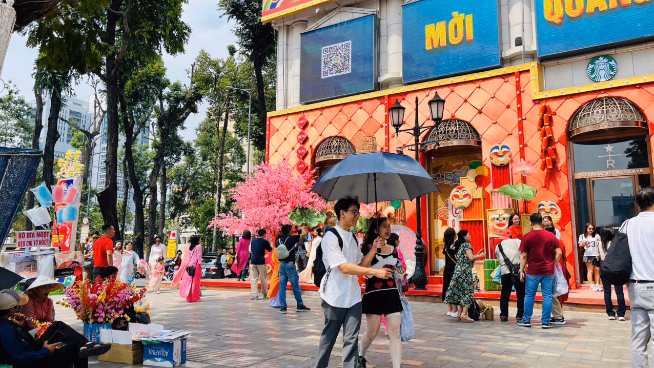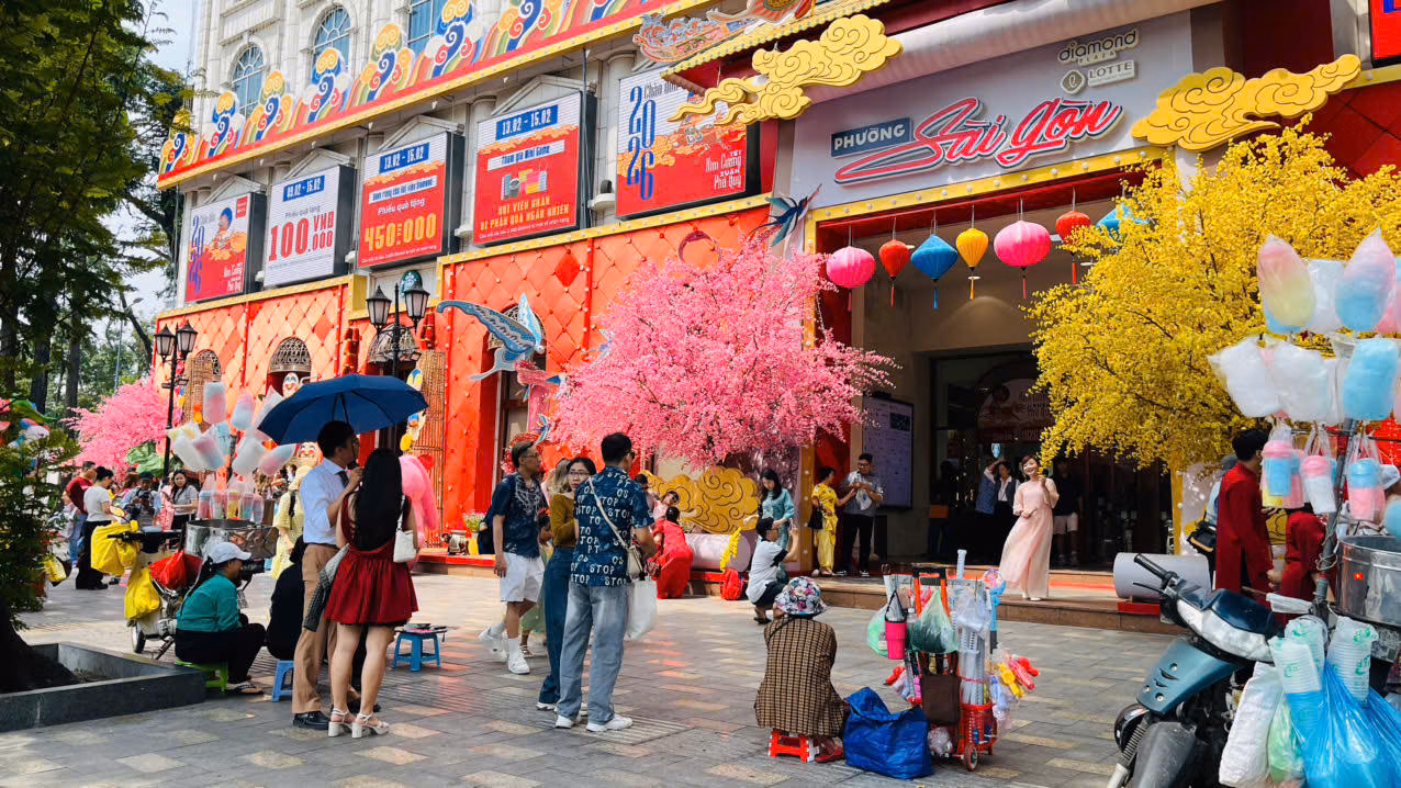 Trong khi đó, Diamond Plaza trở thành điểm dừng chân quen thuộc của nhiều bạn trẻ và du khách. Không gian được trang trí rực rỡ, nhiều góc chụp ảnh được thiết kế sẵn, thu hút mọi người ghi lại khoảnh khắc du xuân giữa lòng thành phố.