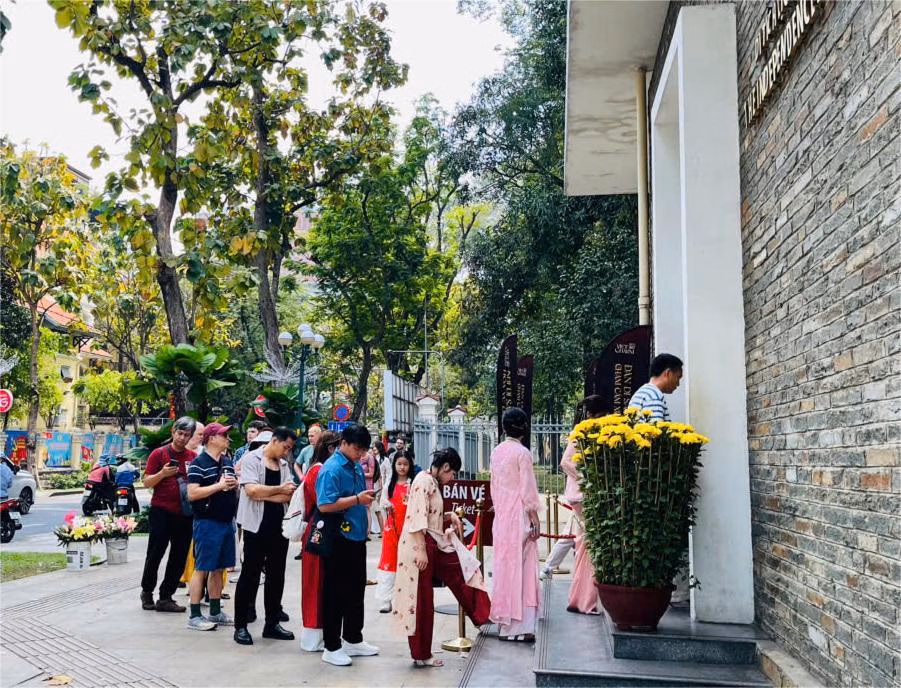 Ghi nhận tại Dinh Thống Nhất, dù đã gần 11 giờ 30, dòng người vẫn xếp hàng dài chờ mua vé tham quan.