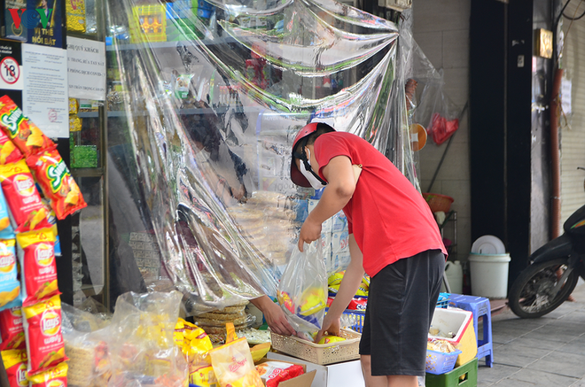 Hay cách đơn giản hơn là lập “hàng rào” trước cửa hàng bằng những thùng catton để đảm bảo khoảng cách an toàn. Một quán bán hàng tạp hóa tại Hà Nội cũng căng lớp vách ngăn nhựa, nilon trước cửa nhằm hạn chế tiếp xúc giữa người bán và người mua hàng. Chủ cửa hàng này còn dán thông báo hướng dẫn cách mua mới.