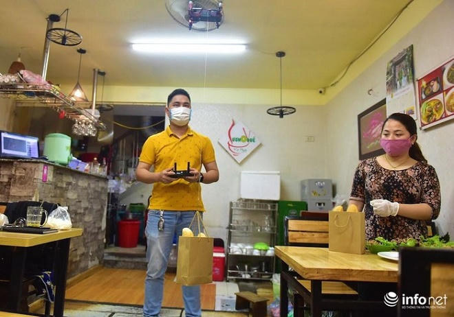 Một quán ăn ở Hà Nội cũng tiên phong phục vụ giảm tiếp xúc trong mùa dịch Covid-19 bằng máy bay điều khiển từ xa. Anh Sơn (chủ quán), ban đầu anh chỉ dùng thiết bị flycam chuyển những đồ ăn nhỏ nhẹ như bánh mì, sau đó thấy ổn nên anh tiếp tục cho chuyển cả rau ra phục vụ khách hàng.