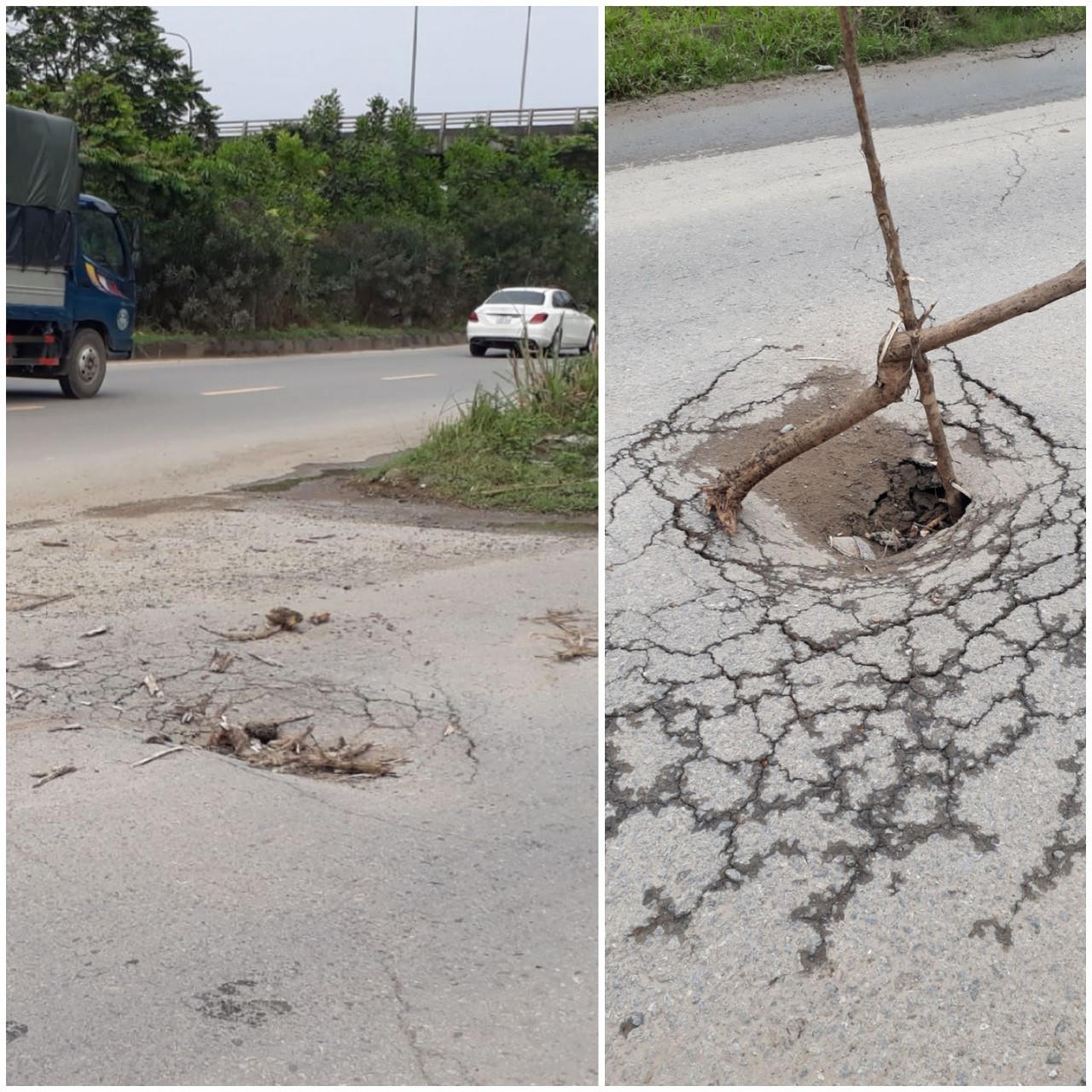 Phía đối diện hướng bên trái Đại lộ, đoạn dẫn từ đường gom vào xã An Khánh, công trình xuống cấp, sụt lún, gây nguy hiểm trong tham gia giao thông, nhất là về đêm.