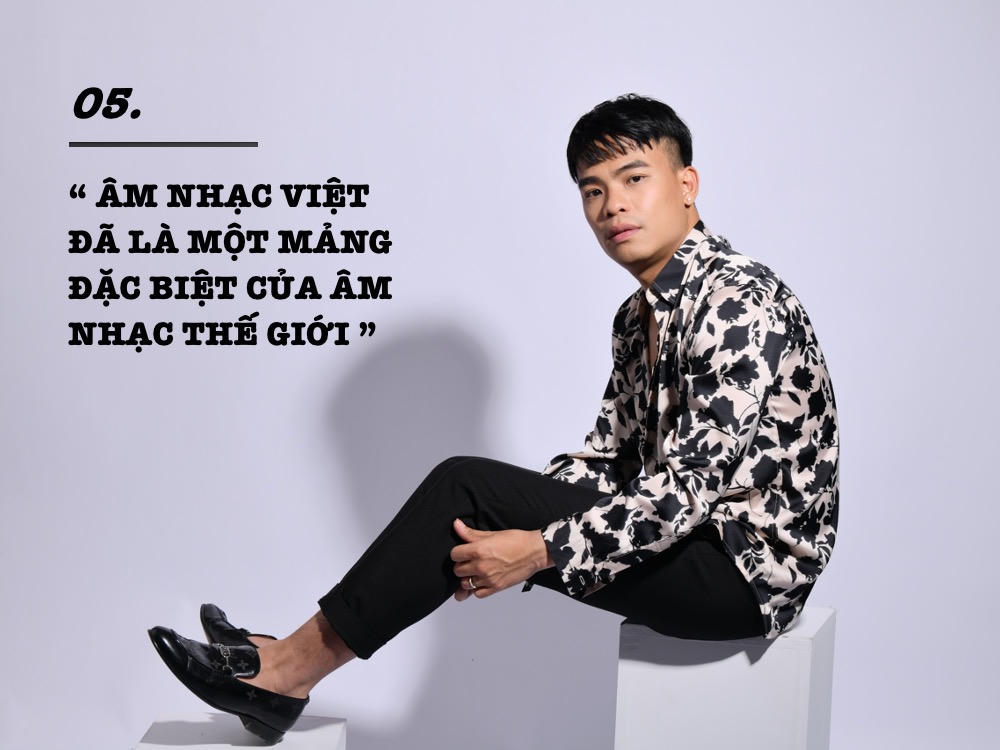 - Âm nhạc Việt luôn luôn là một mảng đặc biệt trong âm nhạc thế giới. Đang có rất nhiều phát ngôn kì cục như “chúng ta phải cố bao nhiêu lâu để vươn ra thế giới” nhưng tôi cho rằng điều này ko cần thiết. Dân số Việt Nam có gần trăm triệu người và vẫn đang nghe rất ổn âm nhạc Việt, vậy thì tại sao cứ phải suy nghĩ về việc mình phải chạy bao nhiêu lâu mới đến được thế giới.