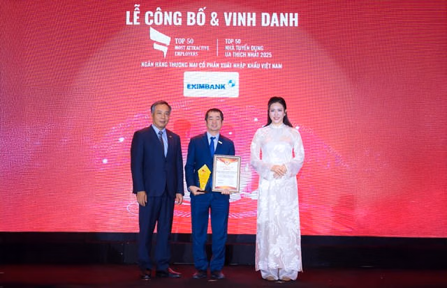 Tại sự kiện, Eximbank xuất sắc được xướng tên ở 3 hạng mục: Top 10 Nơi làm việc tốt nhất Việt Nam trong ngành, Top 50 Nhà tuyển dụng được yêu thích nhất, và Top 500 Nhà tuyển dụng hàng đầu Việt Nam. Đây là minh chứng cho những nỗ lực bền bỉ của Ngân hàng trong việc xây dựng môi trường làm việc chuyên nghiệp, phát triển nguồn nhân lực chất lượng cao và nâng cao trải nghiệm cho người lao động.