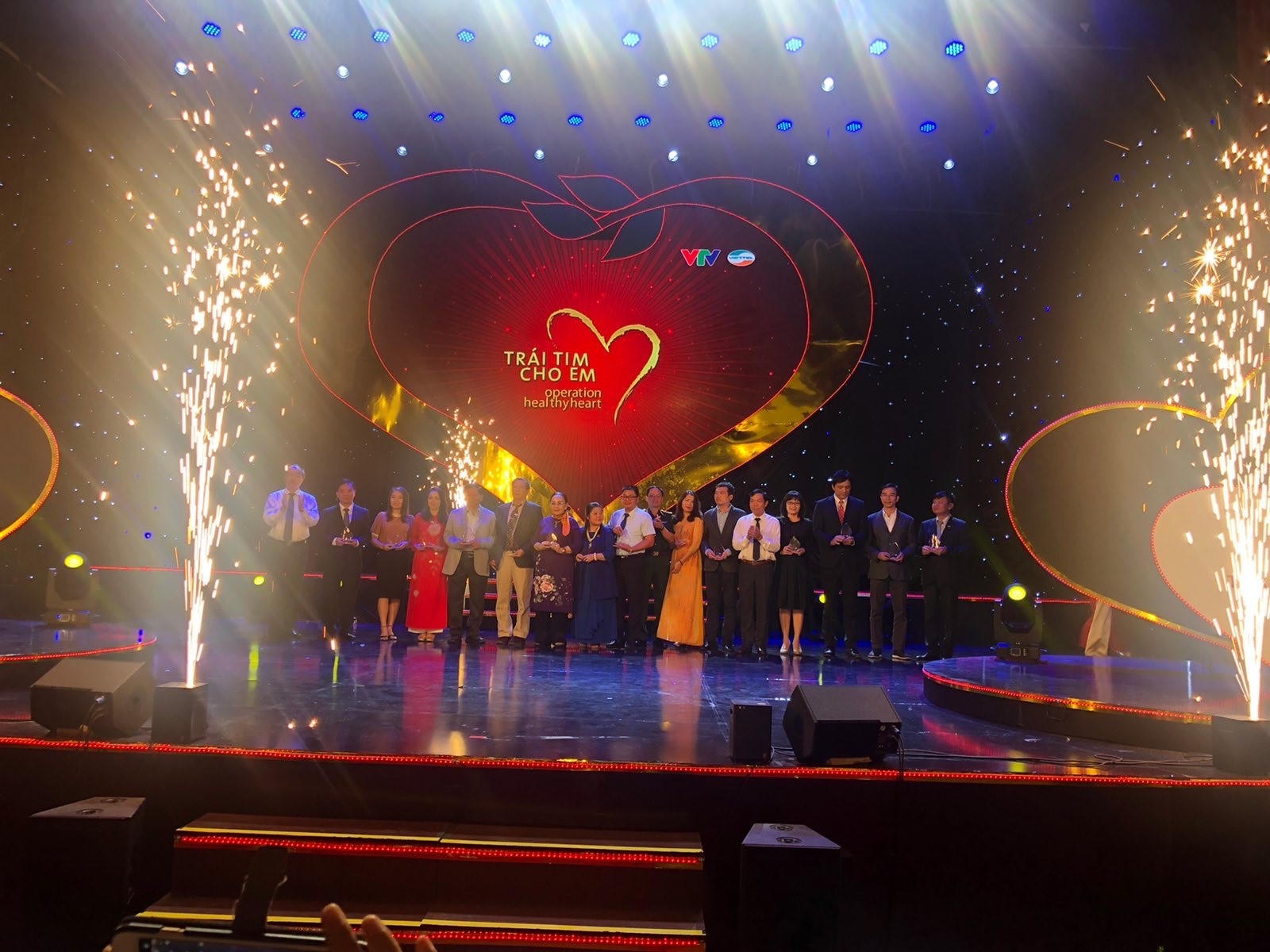 Bà Đinh Thị Thu Thảo – Phó Tổng Giám đốc đại diện Eximbank (thứ tư từ phải sang) trao tặng số tiền 310 triệu được quyên góp trên cho chương trình “Trái tim cho em” diễn ra trực tiếp tại Nhà hát Quân đội TP.HCM buổi tối ngày 15/12/2019.