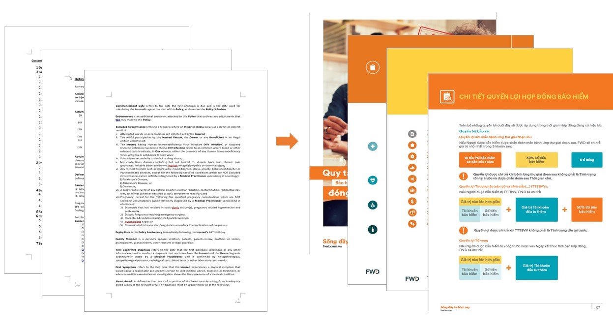 Để làm được điều này, FWD đã nghiên cứu và rà soát lại toàn bộ các nội dung, chỉnh sửa, cải tiến và sắp xếp lại để phù hợp với thói quen và xu hướng đọc thông tin của số đông. Từ đó, FWD sử dụng thêm hình minh họa, các biểu tượng, ví dụ minh họa, hình vẽ; sử dụng các từ ngữ đơn giản, dễ hiểu; chuyển các câu ghép thành các câu đơn; trình bày nội dung theo từng nhóm chủ đề chuyên biệt; giải thích thuật ngữ ngay tại chỗ…