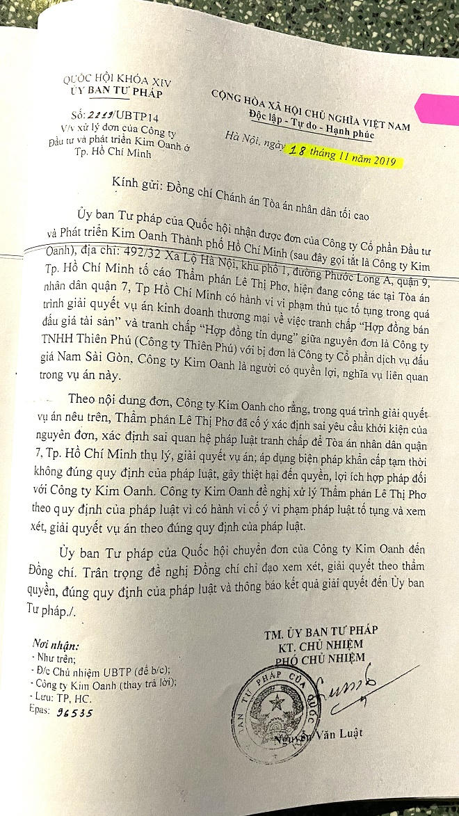 Kim Oanh đã đầu tư vào dự án hàng ngàn tỷ; và sau khi thoát món nợ khổng lồ với ngân hàng, bên có tài sản phát mãi là Công ty TNHH Sản xuất & Thương mại Thiên Phú (trụ sở phường Phú Cường, TP Thủ Dầu Một, Bình Dương) bất ngờ khiếu nại hành chính đòi hủy kết quả đấu giá. Vụ việc được đưa đến giải quyết ở cơ quan hành chính cao nhất của Nhà nước với kết luận kết quả đấu giá không thể hủy bỏ.