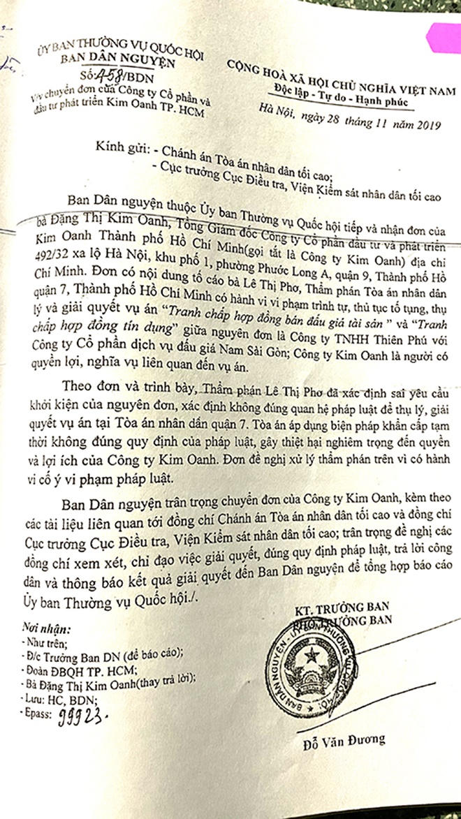 “Rồi đúng 4h chiều ngày 14/3/2019, Kim Oanh vừa hoàn tất trả tiền mua đấu giá trúng Dự án Hòa Lân, thì 5h chiều là bị một cái lệnh “phong tỏa” Dự án Hòa Lân của TAND quận 7, TP HCM. Như vậy là họ “thập diện mai phục” “đánh” hòng triệt hạ Kim Oanh, để tôi không bao giờ tìm ra tiền trả tiền mua dự án. Khi không chặn nguồn tài chính của tôi được thì họ dùng “kênh” khác”.