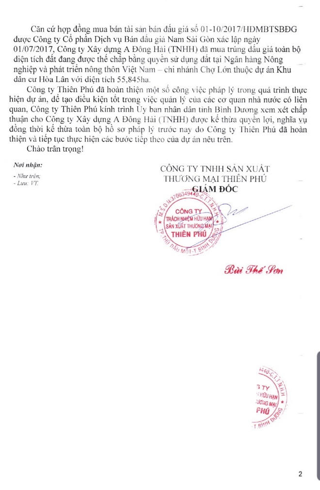 Ngày 14/8/2017, Thiên Phú cũng đã có Văn bản số 018/CV/2017 do Giám đốc Bùi Thế Sơn ký, gửi UBND tỉnh Bình Dương đề nghị chuyển đổi chủ đầu tư dự án sang Kim Oanh. Văn bản nêu rõ: “Năm 2008-2012, kinh tế khủng khoảng, thị trường BĐS “đóng băng” nên việc mua bán gặp nhiều khó khăn, dẫn đến việc chậm trả nợ vay ngân hàng. Vì vậy Thiên Phú đã thống nhất để Agribank bán đấu giá tài sản để thu hồi nợ”.