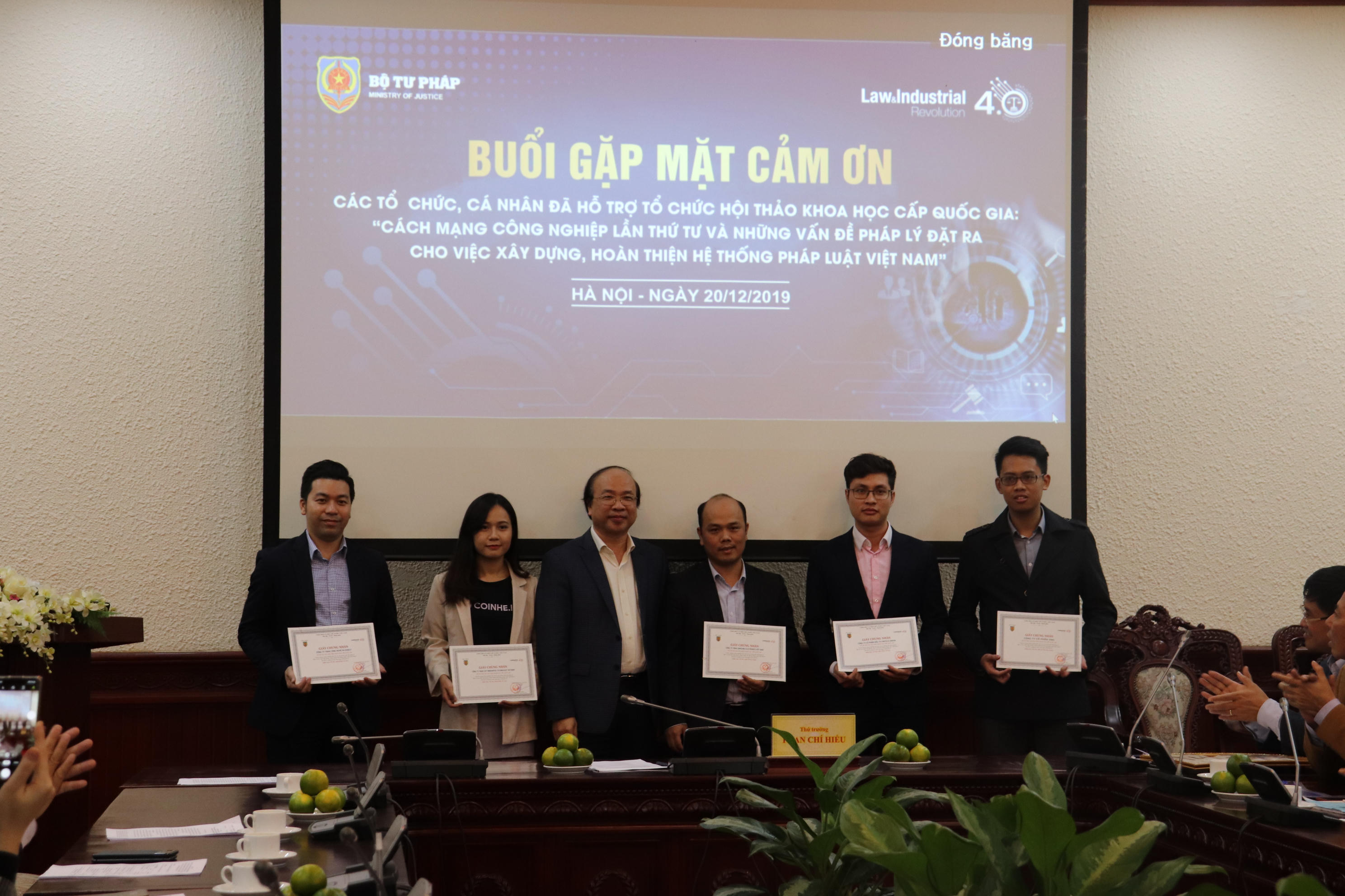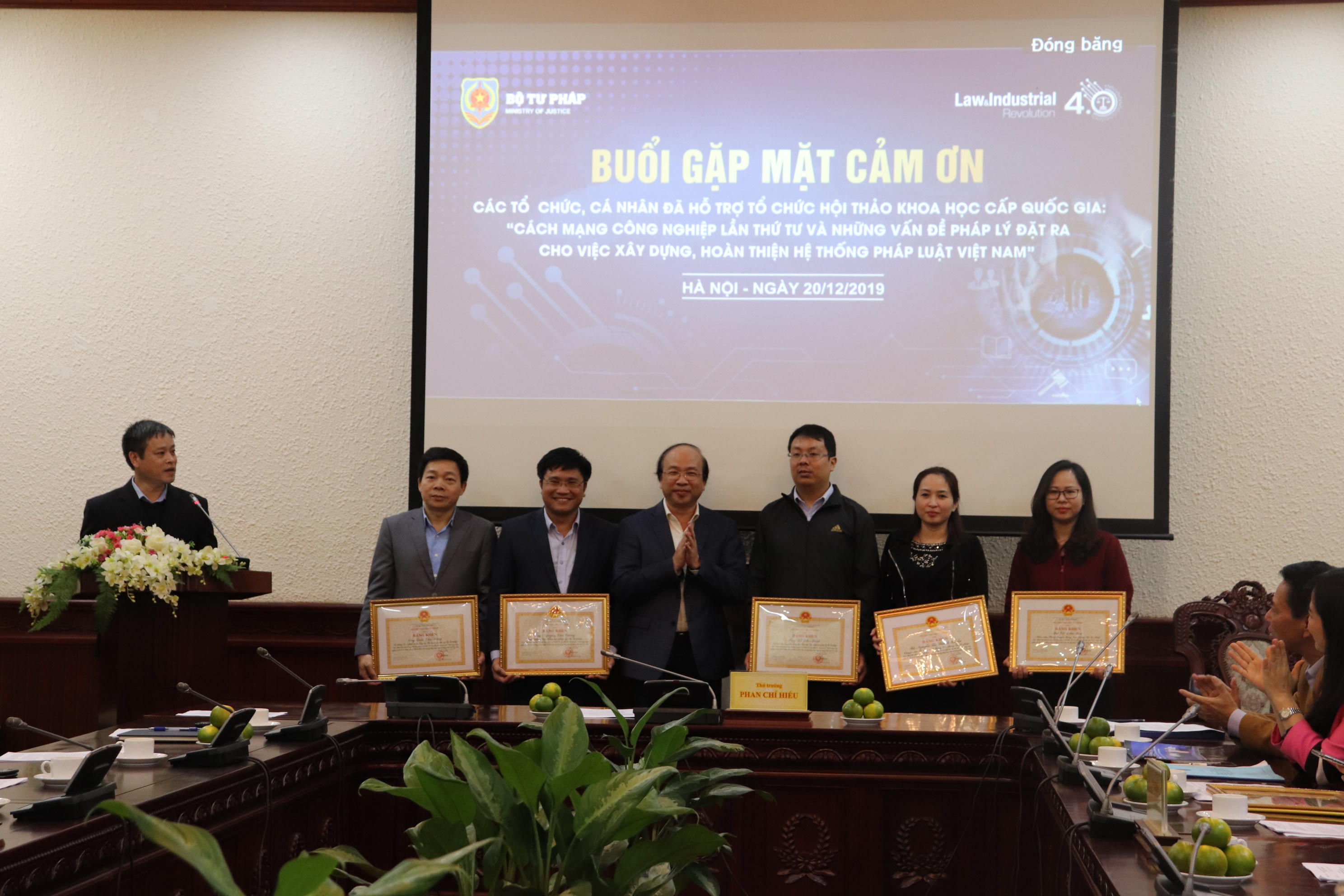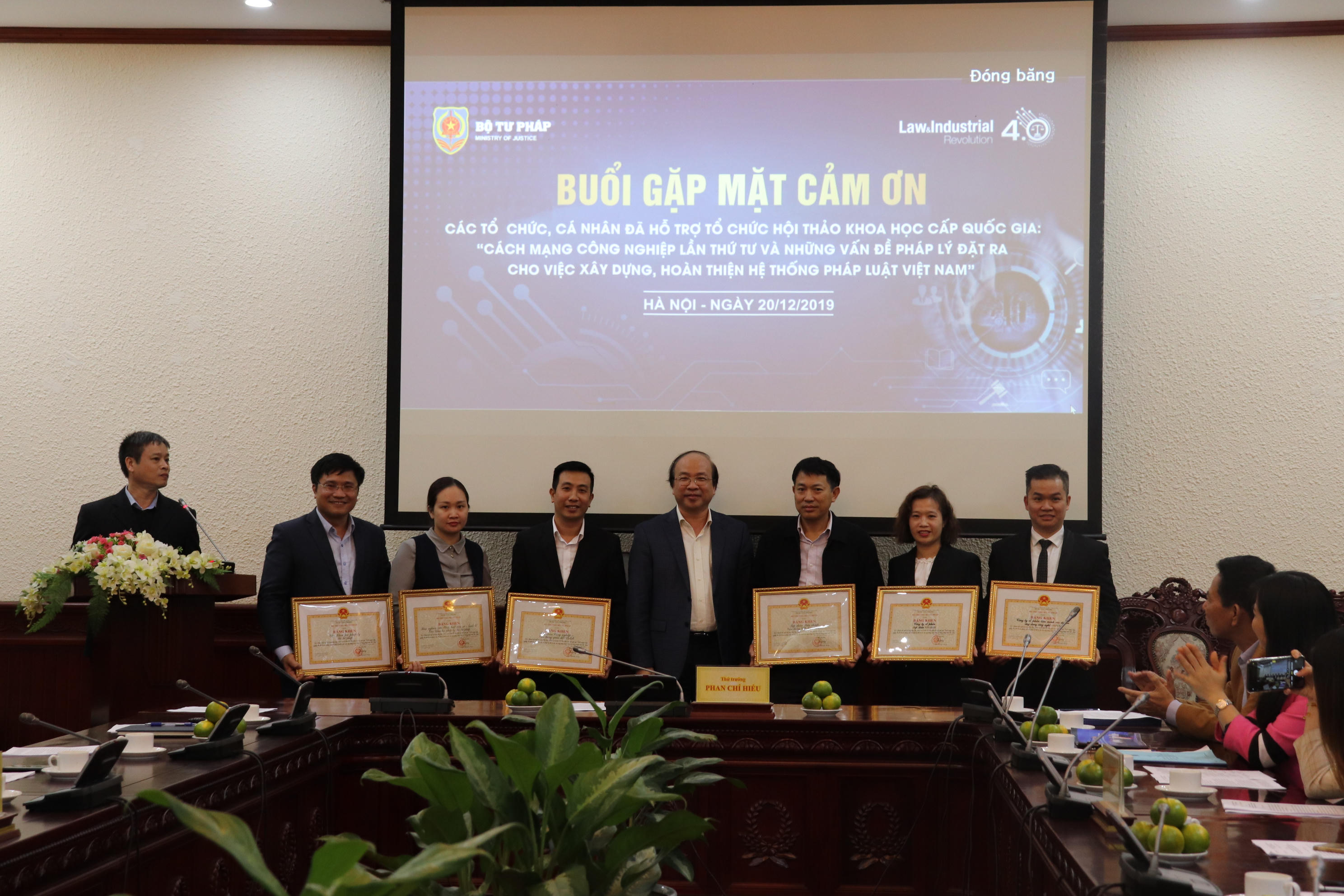 (PLVN) - Chiều 20/12, Thứ trưởng Phan Chí Hiếu đã có buổi gặp mặt cảm ơn các tổ chức, cá nhân hỗ trợ tổ chức Hội thảo khoa học cấp quốc gia “Cách mạng công nghiệp lần thứ tư và những vấn đề pháp lý đặt ra cho việc xây dựng, hoàn thiện hệ thống pháp luật Việt Nam” diễn ra hồi tháng 6/2019.