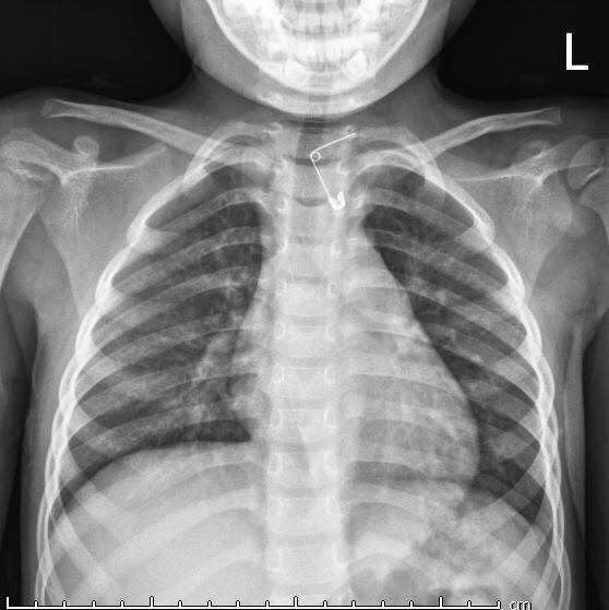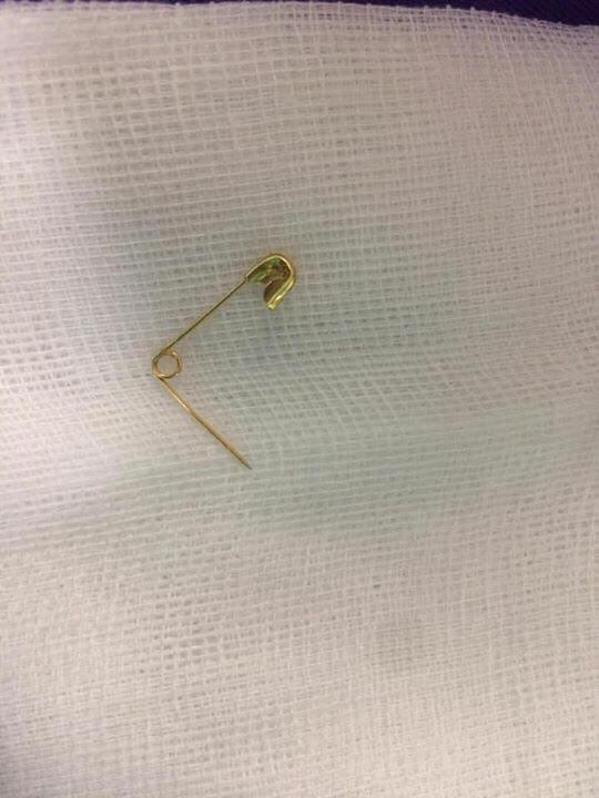 Kết quả khám lâm sàng cho thấy hình ảnh dị vật là một chiếc kim băng đang mở, một đầu nhọn đang cắm vào thành thực quản của trẻ.