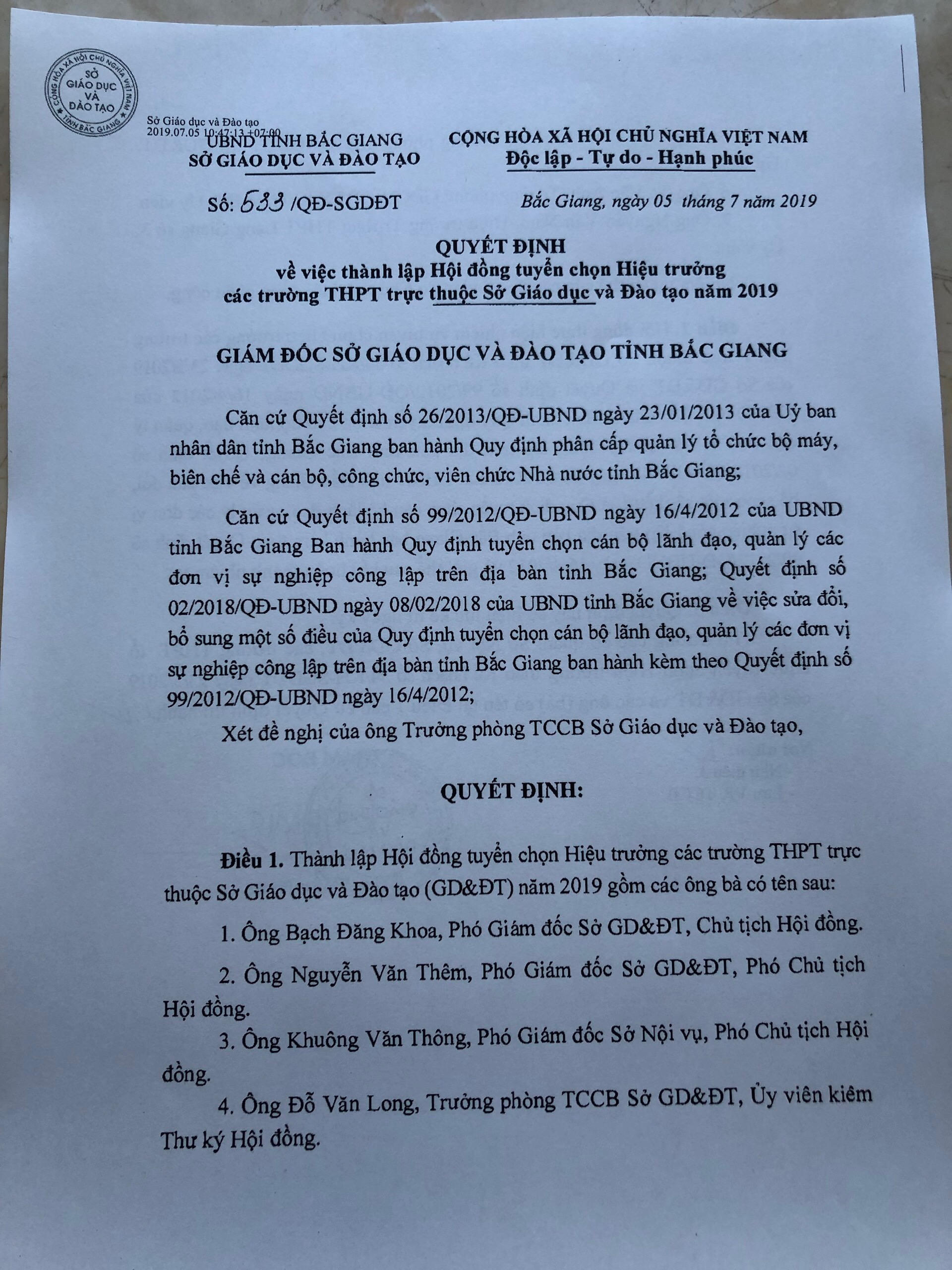 Từ đơn thư của độc giả, Báo PLVN đã vào cuộc điều tra, tìm hiểu và được biết, Sở GD&ĐT Bắc Giang đã thành lập Hội đồng tuyển chọn (viết tắt là HĐTC) để tuyển chọn, bổ nhiệm chức danh Hiệu trưởng các trường THPT trực thuộc Sở GD&ĐT năm 2019.