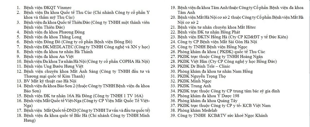 - Bà có thể cho biết danh sách các bệnh viện và cơ sở khám chữa bệnh tư nhân trên địa bàn Hà Nội đã ký hợp đồng khám chữa bệnh bảo hiểm y tế?