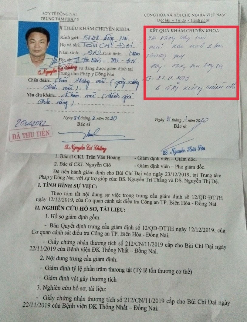 Đến ngày 21/11/2019, tức 03 ngày kể từ khi bị đánh, ông Đại làm đơn gửi Công an TP Biên Hoà yêu cầu làm rõ sự việc thì được đưa đi giám định. Sau đó, không đồng tình với kết quả giám định, ngày 07/02/2020, ông Đại lại tiếp tục làm đơn khiếu nại lên Hội đồng Giám định pháp y. Ngay sau đó, Hội đồng Giám định pháp y, Công an TP Biên Hoà cùng Bệnh viện Thống Nhất đã kiểm tra toàn bộ phim ảnh chụp đầu, mũi, mắt rồi đưa ra kết luận: Gãy xương chính mũi…